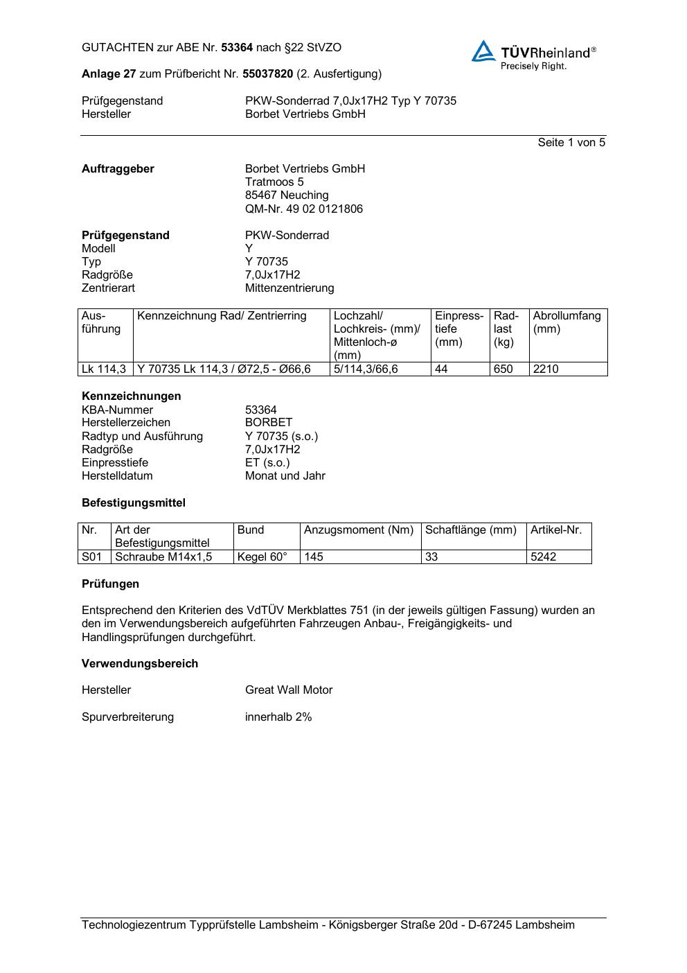 Dieses Gutachten (abe) bezieht sich auf die Alufelge Borbet Y 70735 in der Ausführung 7Jx17 ET 0, Mittenloch 0 mm (KBA 53364). Im PDF findest du typischerweise zulässige Reifengrößen, Auflagen/Anbauhinweise und – je nach Dokument – Hinweise zur Eintragung.