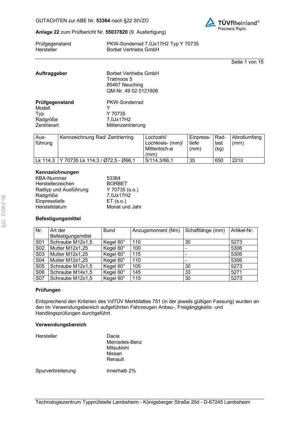 Dieses Gutachten (abe) bezieht sich auf die Alufelge Borbet Y 70735 in der Ausführung 7Jx17 ET 0, Mittenloch 0 mm (KBA 53364). Im PDF findest du typischerweise zulässige Reifengrößen, Auflagen/Anbauhinweise und – je nach Dokument – Hinweise zur Eintragung.