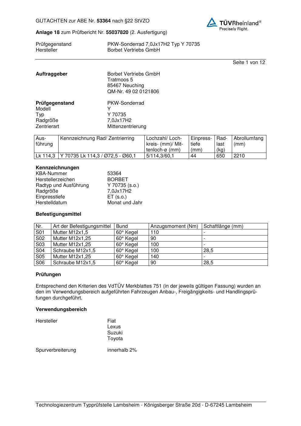 Dieses Gutachten (abe) bezieht sich auf die Alufelge Borbet Y 70735 in der Ausführung 7Jx17 ET 0, Mittenloch 0 mm (KBA 53364). Im PDF findest du typischerweise zulässige Reifengrößen, Auflagen/Anbauhinweise und – je nach Dokument – Hinweise zur Eintragung.