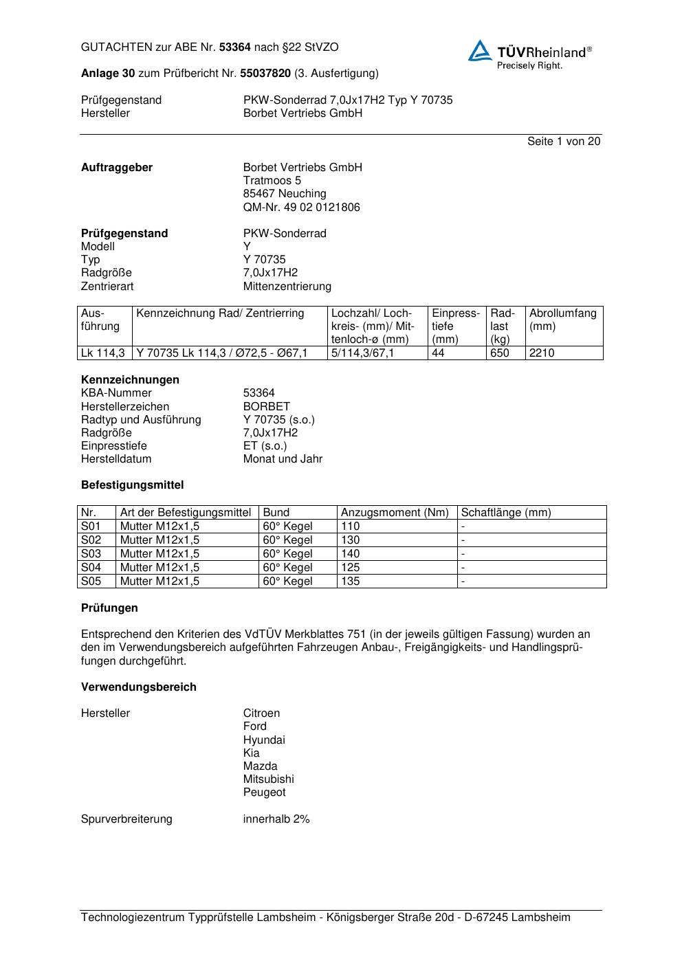 Dieses Gutachten (abe) bezieht sich auf die Alufelge Borbet Y 70735 in der Ausführung 7Jx17 ET 0, Mittenloch 0 mm (KBA 53364). Im PDF findest du typischerweise zulässige Reifengrößen, Auflagen/Anbauhinweise und – je nach Dokument – Hinweise zur Eintragung.