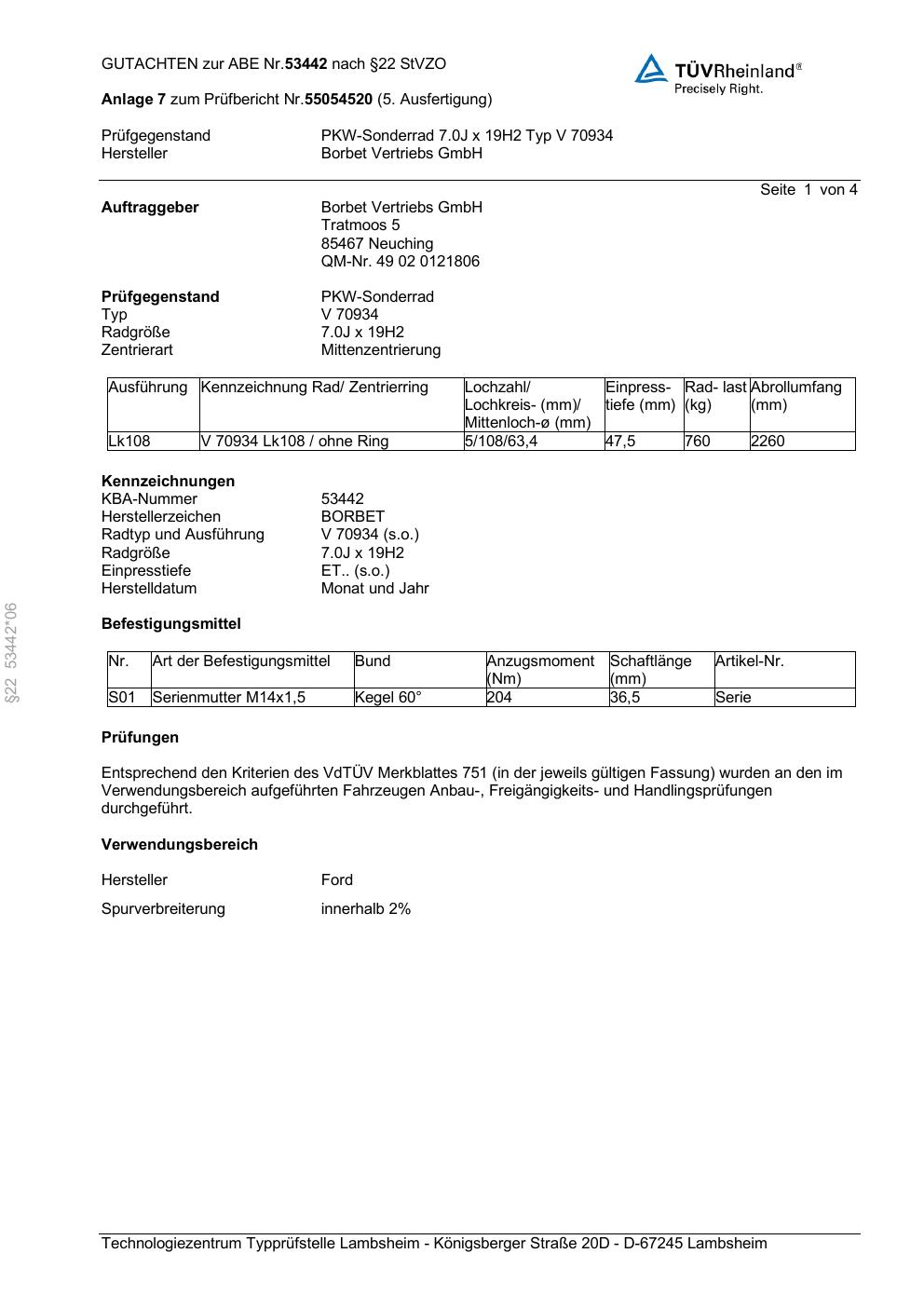 Dieses Gutachten (abe) bezieht sich auf die Alufelge Borbet V 70934 in der Ausführung 7Jx19 ET 0, Mittenloch 0 mm (KBA 53442). Im PDF findest du typischerweise zulässige Reifengrößen, Auflagen/Anbauhinweise und – je nach Dokument – Hinweise zur Eintragung.