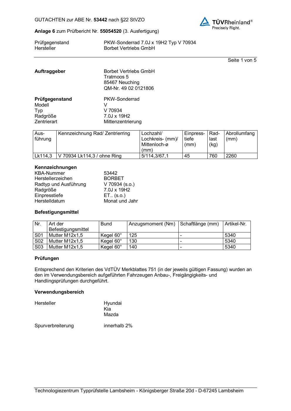Dieses Gutachten (abe) bezieht sich auf die Alufelge Borbet V 70934 in der Ausführung 7Jx19 ET 0, Mittenloch 0 mm (KBA 53442). Im PDF findest du typischerweise zulässige Reifengrößen, Auflagen/Anbauhinweise und – je nach Dokument – Hinweise zur Eintragung.