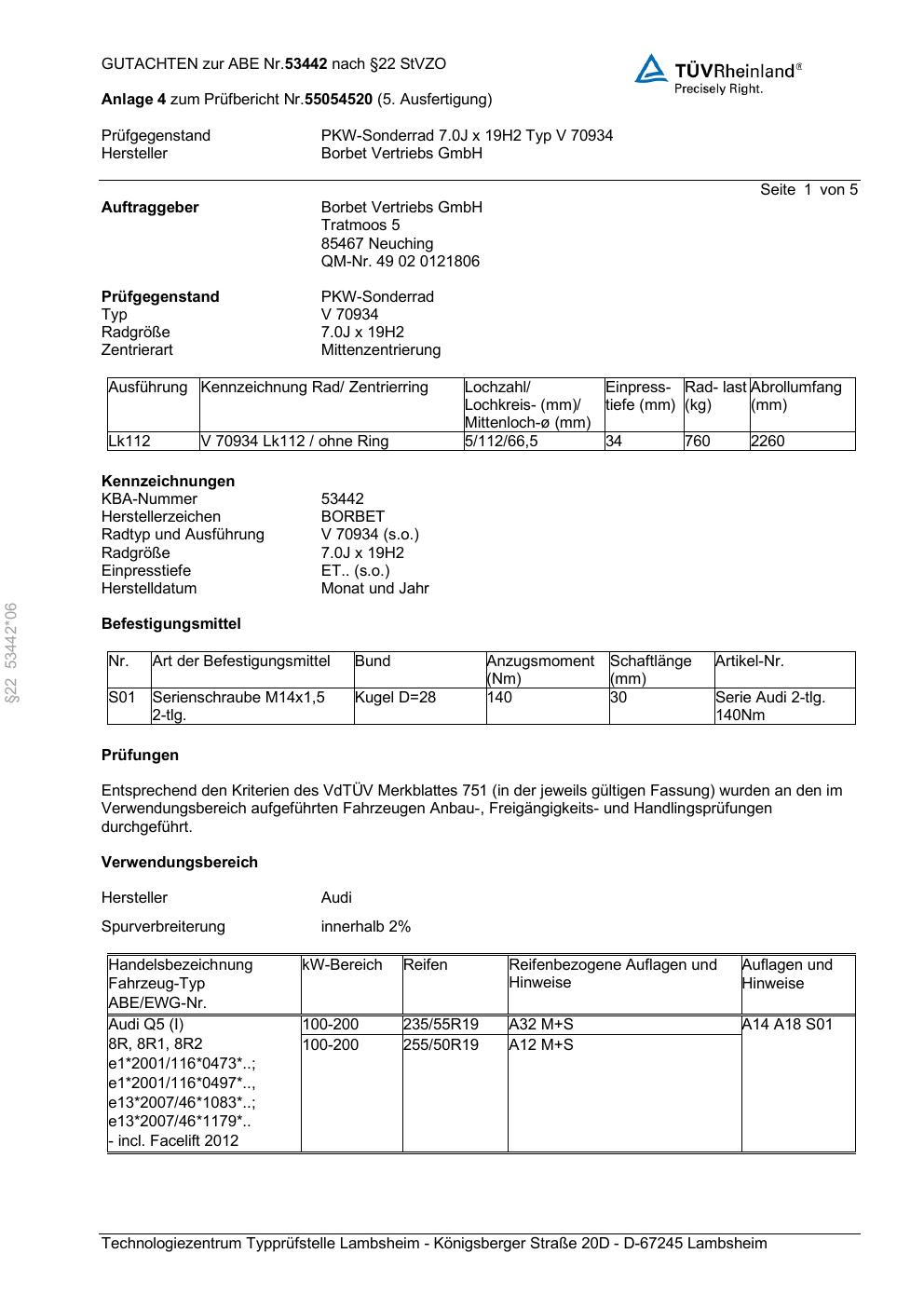 Dieses Gutachten (abe) bezieht sich auf die Alufelge Borbet V 70934 in der Ausführung 7Jx19 ET 0, Mittenloch 0 mm (KBA 53442). Im PDF findest du typischerweise zulässige Reifengrößen, Auflagen/Anbauhinweise und – je nach Dokument – Hinweise zur Eintragung.