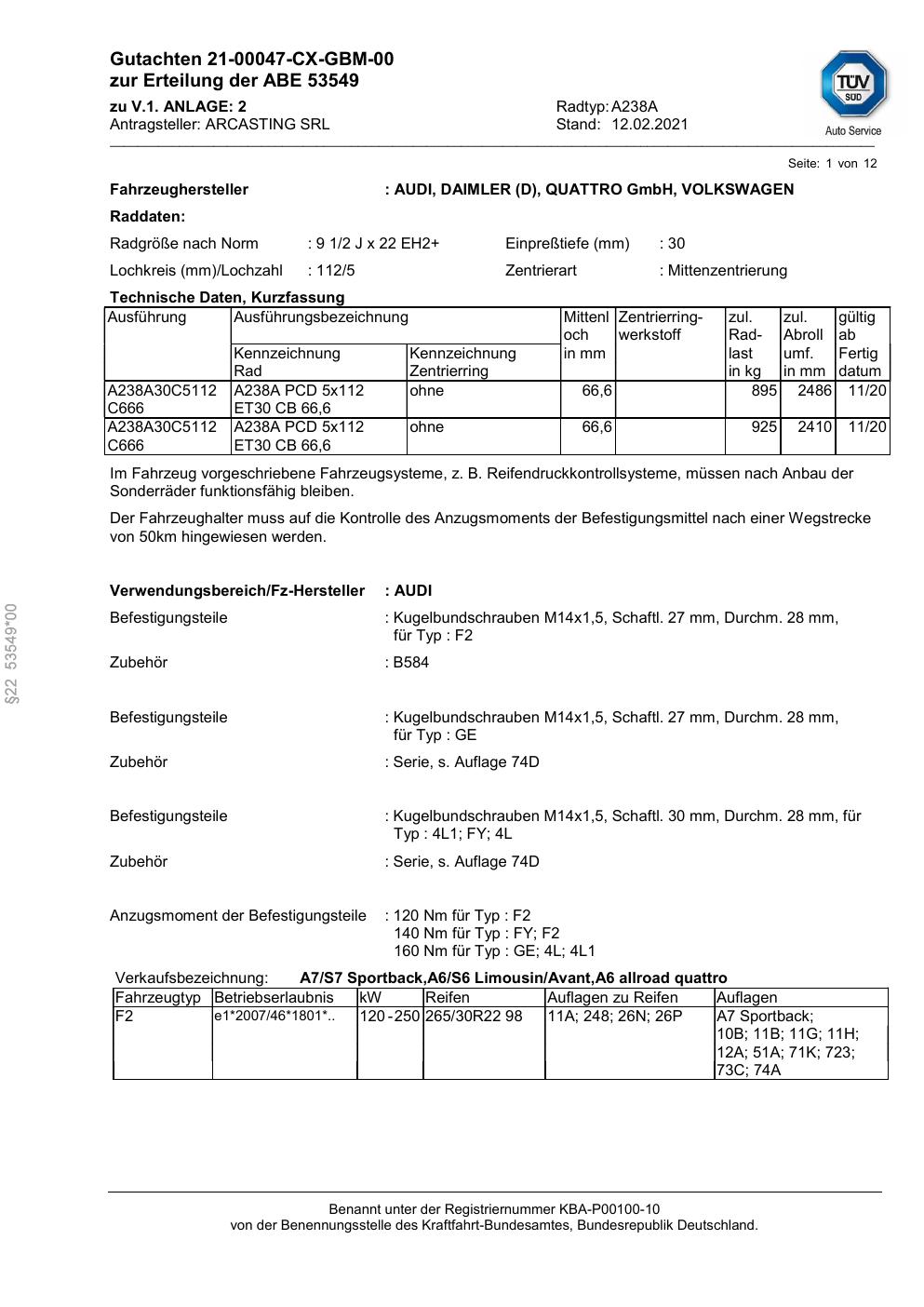 Dieses Gutachten (abe) bezieht sich auf die Alufelge ATS A238A in der Ausführung 2Jx22 ET 0, Mittenloch 0 mm (KBA 53549). Im PDF findest du typischerweise zulässige Reifengrößen, Auflagen/Anbauhinweise und – je nach Dokument – Hinweise zur Eintragung.