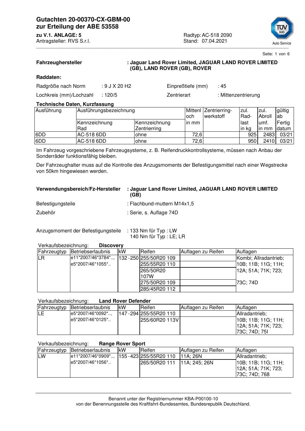 Dieses Gutachten (abe) bezieht sich auf die Alufelge ATS AC-518 2090 in der Ausführung 9Jx2 ET 0, Mittenloch 0 mm (KBA 53558). Im PDF findest du typischerweise zulässige Reifengrößen, Auflagen/Anbauhinweise und – je nach Dokument – Hinweise zur Eintragung.