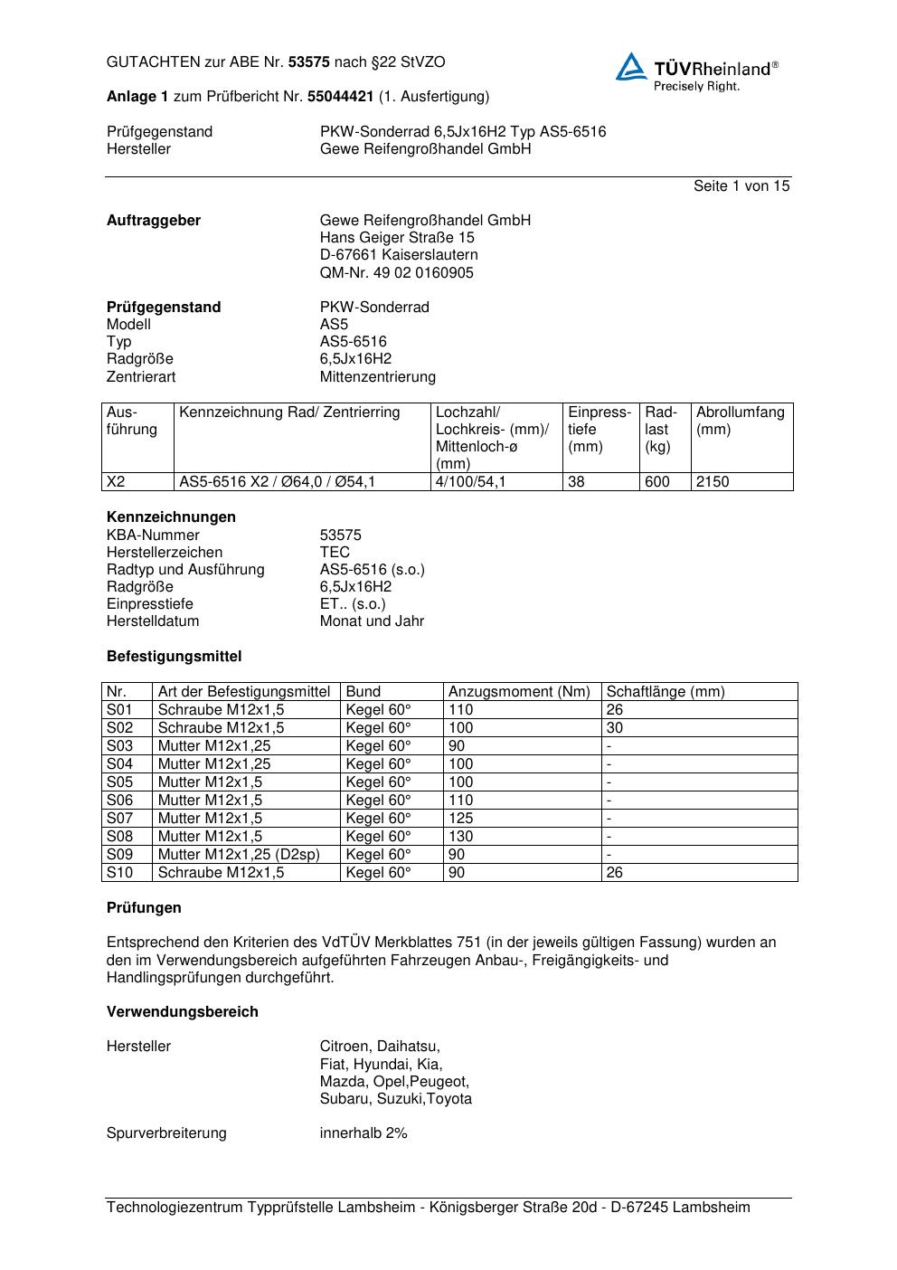 Dieses Gutachten (abe) bezieht sich auf die Alufelge ATS AS5-6516 in der Ausführung 6.5Jx16 ET 0, Mittenloch 0 mm (KBA 53575). Im PDF findest du typischerweise zulässige Reifengrößen, Auflagen/Anbauhinweise und – je nach Dokument – Hinweise zur Eintragung.