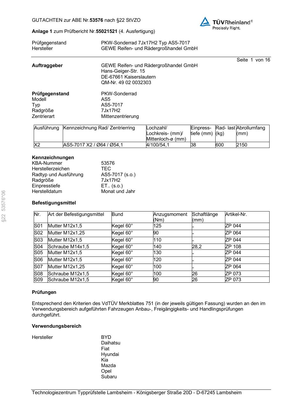 Dieses Gutachten (abe) bezieht sich auf die Alufelge ATS AS5-7017 in der Ausführung 7Jx17 ET 0, Mittenloch 0 mm (KBA 53576). Im PDF findest du typischerweise zulässige Reifengrößen, Auflagen/Anbauhinweise und – je nach Dokument – Hinweise zur Eintragung.