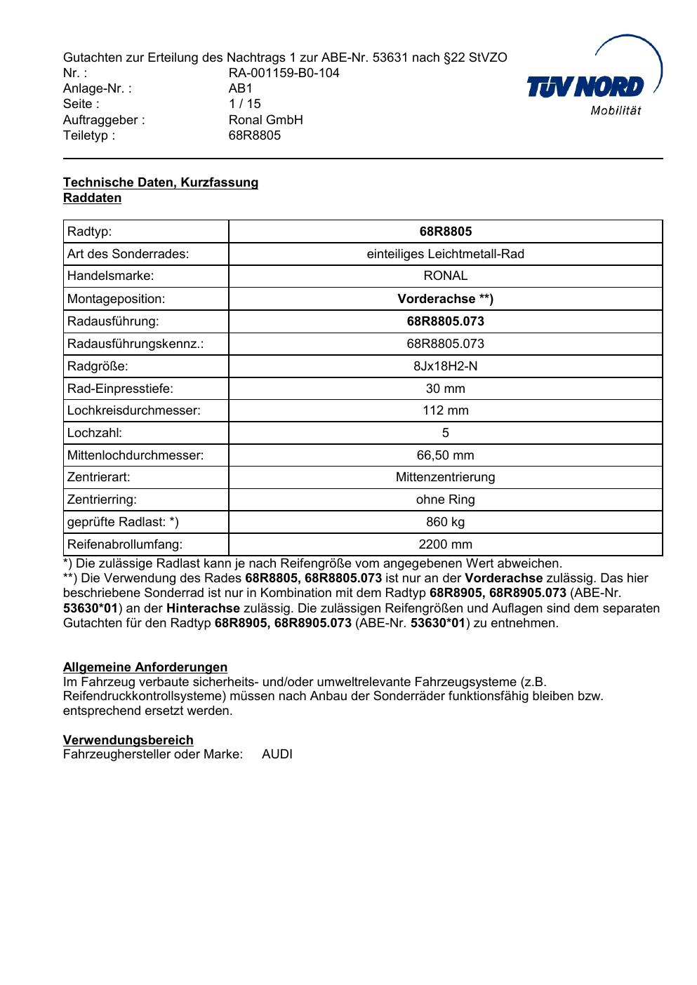 Dieses Gutachten (abe) bezieht sich auf die Alufelge Ronal 68R8805 in der Ausführung 8Jx18 ET 0, Mittenloch 0 mm (KBA 53630). Im PDF findest du typischerweise zulässige Reifengrößen, Auflagen/Anbauhinweise und – je nach Dokument – Hinweise zur Eintragung.