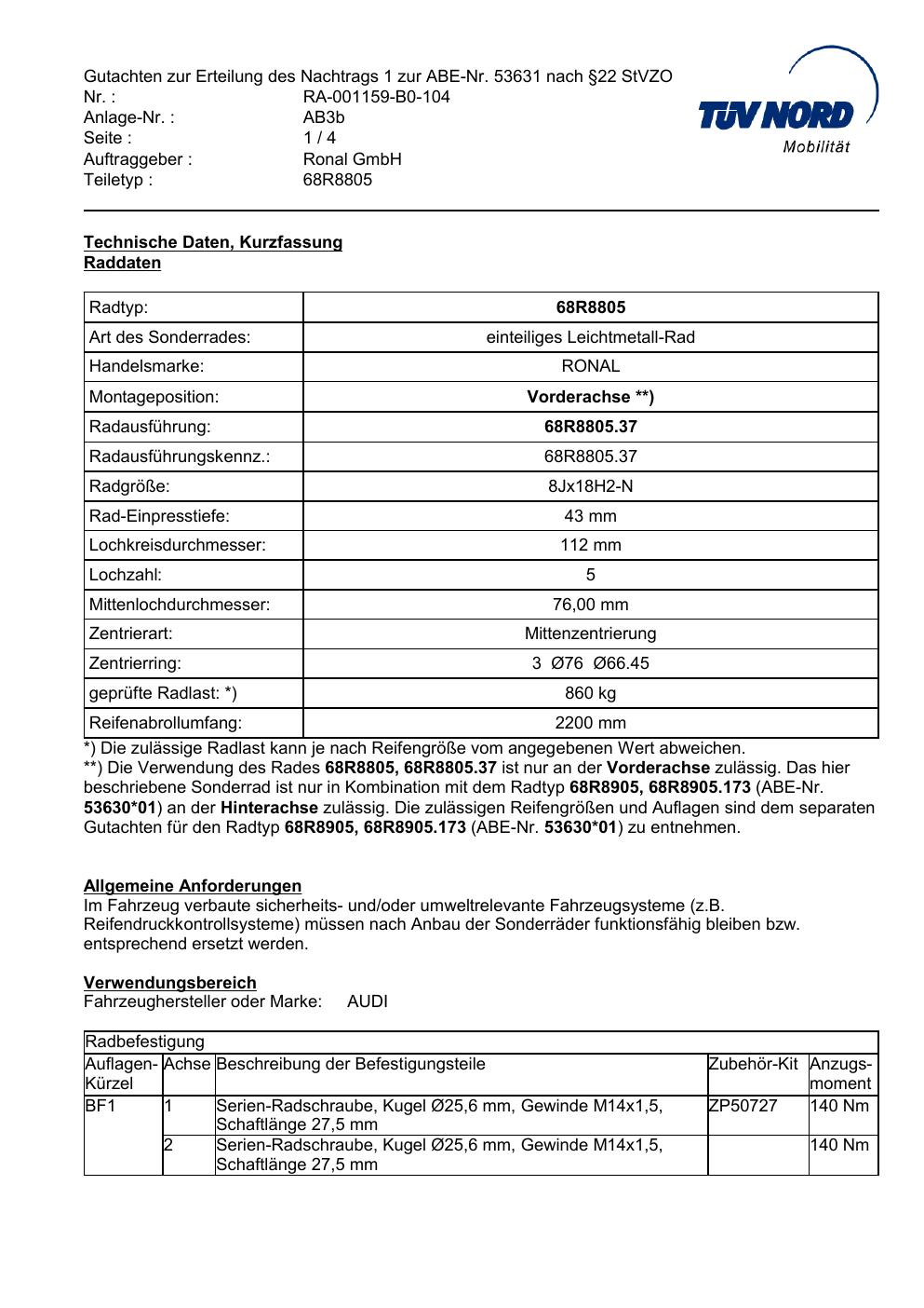 Dieses Gutachten (abe) bezieht sich auf die Alufelge Ronal 68R8805 in der Ausführung 8Jx18 ET 0, Mittenloch 0 mm (KBA 53630). Im PDF findest du typischerweise zulässige Reifengrößen, Auflagen/Anbauhinweise und – je nach Dokument – Hinweise zur Eintragung.