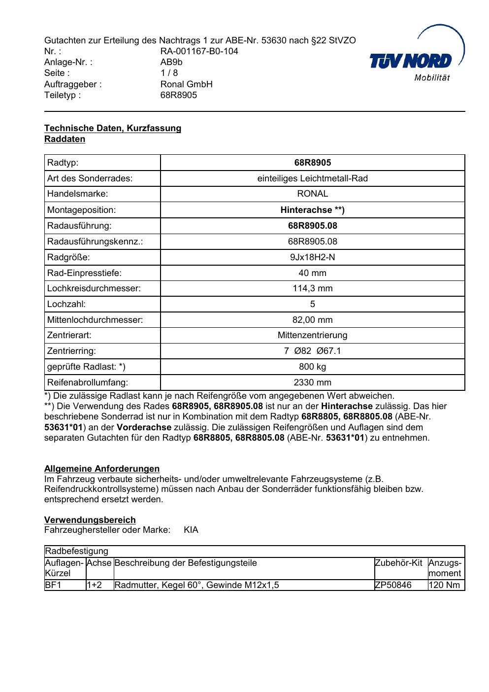 Dieses Gutachten (abe) bezieht sich auf die Alufelge Ronal 68R8905 in der Ausführung 9Jx18 ET 0, Mittenloch 0 mm (KBA 53631). Im PDF findest du typischerweise zulässige Reifengrößen, Auflagen/Anbauhinweise und – je nach Dokument – Hinweise zur Eintragung.