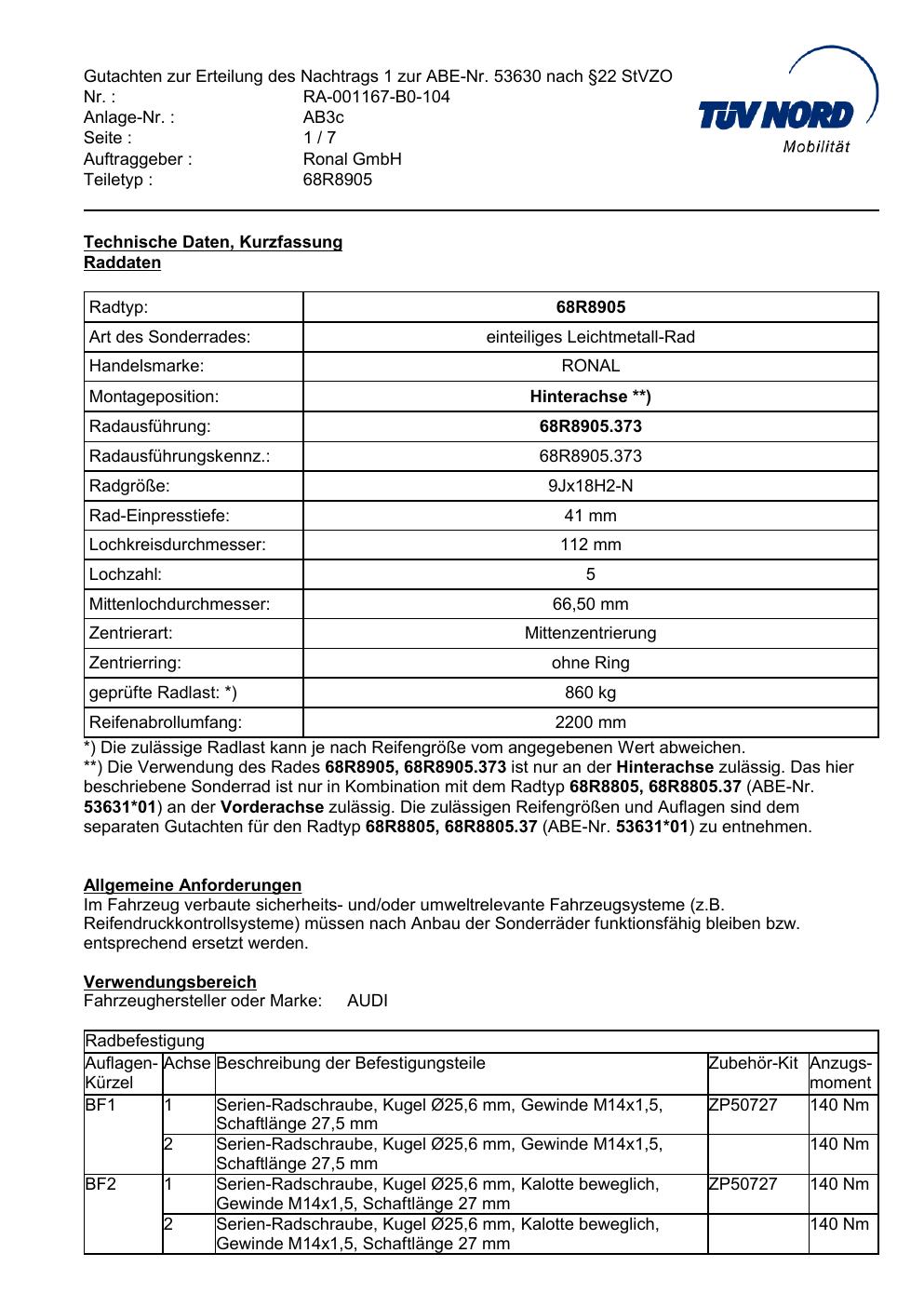 Dieses Gutachten (abe) bezieht sich auf die Alufelge Ronal 68R8905 in der Ausführung 9Jx18 ET 0, Mittenloch 0 mm (KBA 53631). Im PDF findest du typischerweise zulässige Reifengrößen, Auflagen/Anbauhinweise und – je nach Dokument – Hinweise zur Eintragung.