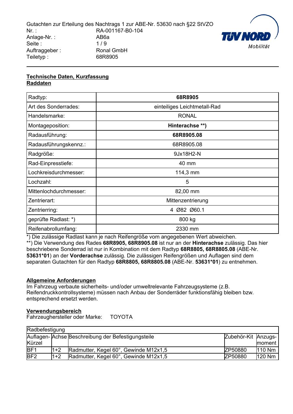 Dieses Gutachten (abe) bezieht sich auf die Alufelge Ronal 68R8905 in der Ausführung 9Jx18 ET 0, Mittenloch 0 mm (KBA 53631). Im PDF findest du typischerweise zulässige Reifengrößen, Auflagen/Anbauhinweise und – je nach Dokument – Hinweise zur Eintragung.
