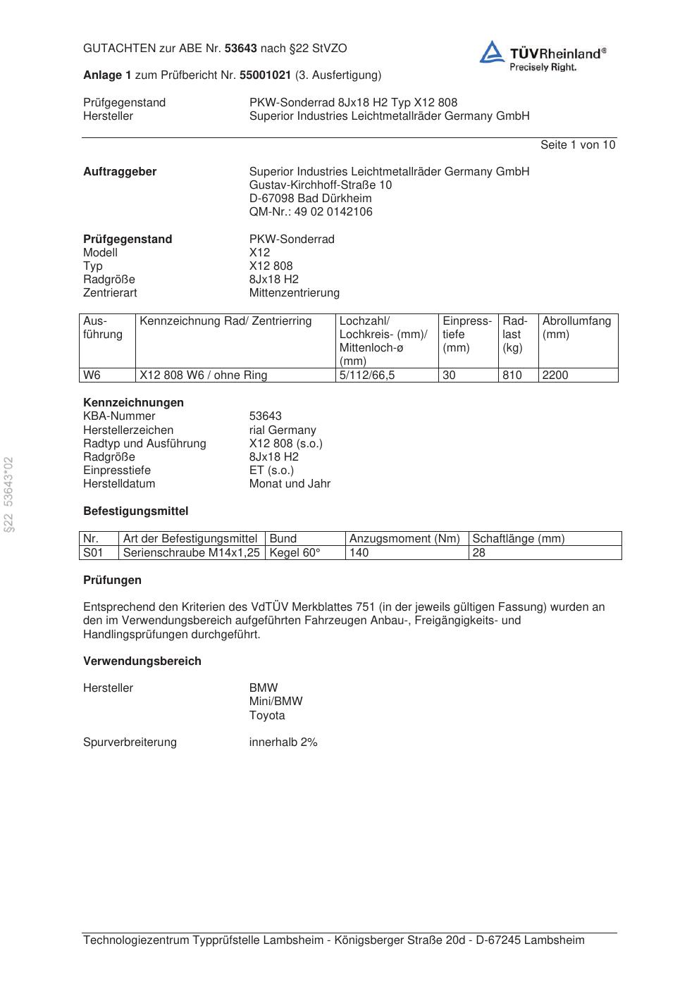 Dieses Gutachten (abe) bezieht sich auf die Alufelge brand-rial X12 808 in der Ausführung 8Jx18 ET 0, Mittenloch 0 mm (KBA 53643). Im PDF findest du typischerweise zulässige Reifengrößen, Auflagen/Anbauhinweise und – je nach Dokument – Hinweise zur Eintragung.