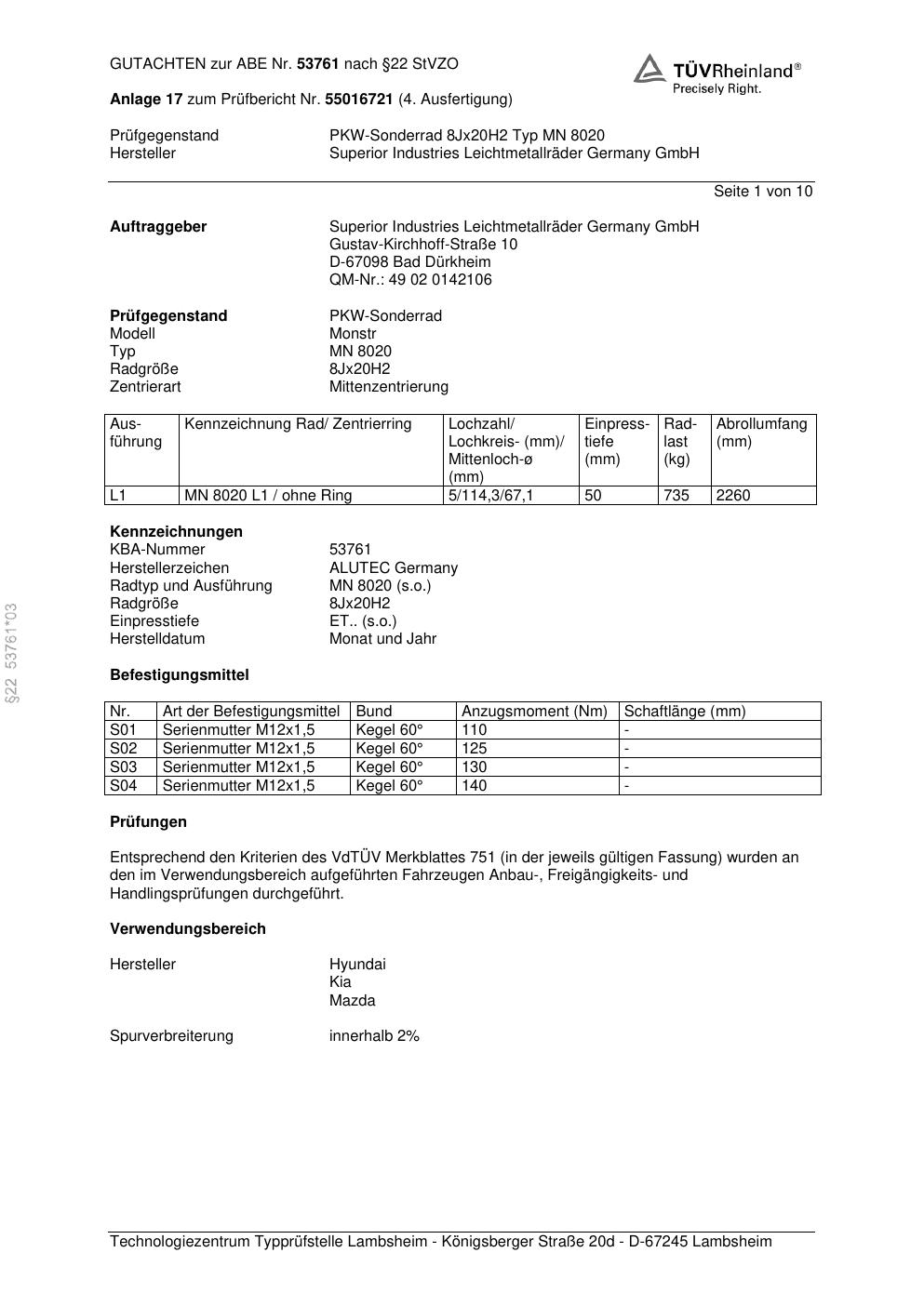 Dieses Gutachten (abe) bezieht sich auf die Alufelge ALUTEC MN 8020 in der Ausführung 8Jx2 ET 0, Mittenloch 0 mm (KBA 53761). Im PDF findest du typischerweise zulässige Reifengrößen, Auflagen/Anbauhinweise und – je nach Dokument – Hinweise zur Eintragung.