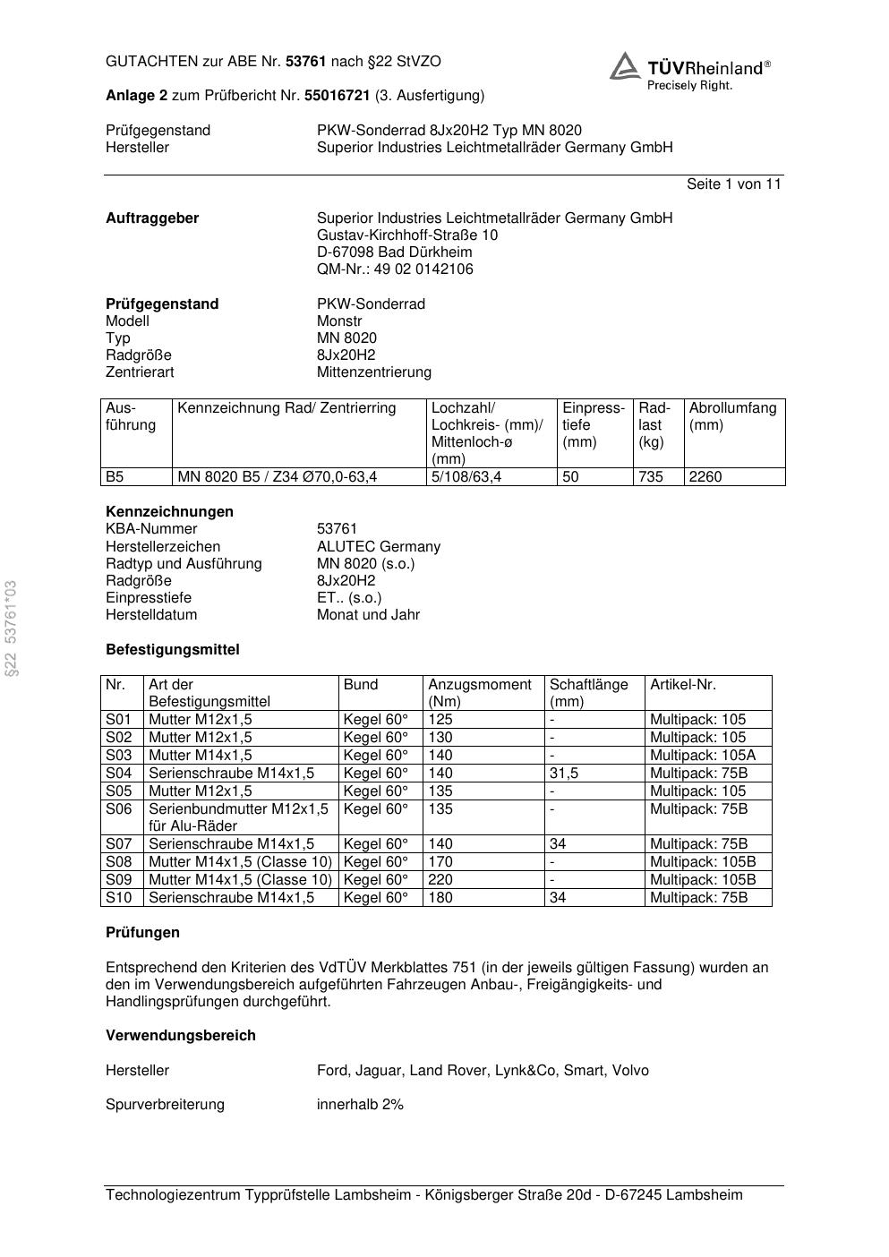 Dieses Gutachten (abe) bezieht sich auf die Alufelge ALUTEC MN 8020 in der Ausführung 8Jx2 ET 0, Mittenloch 0 mm (KBA 53761). Im PDF findest du typischerweise zulässige Reifengrößen, Auflagen/Anbauhinweise und – je nach Dokument – Hinweise zur Eintragung.