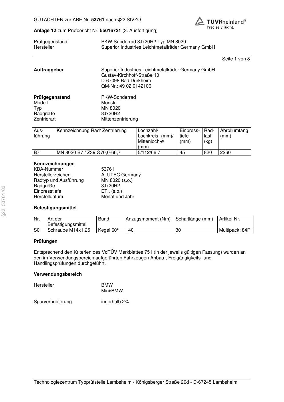 Dieses Gutachten (abe) bezieht sich auf die Alufelge ALUTEC MN 8020 in der Ausführung 8Jx2 ET 0, Mittenloch 0 mm (KBA 53761). Im PDF findest du typischerweise zulässige Reifengrößen, Auflagen/Anbauhinweise und – je nach Dokument – Hinweise zur Eintragung.