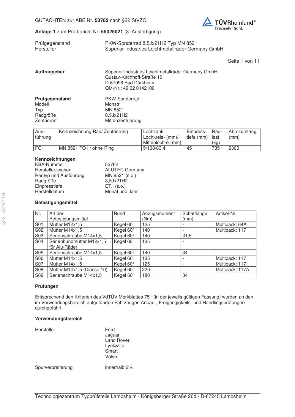 Dieses Gutachten (abe) bezieht sich auf die Alufelge ALUTEC MN 8521 in der Ausführung 8.5Jx21 ET 0, Mittenloch 0 mm (KBA 53762). Im PDF findest du typischerweise zulässige Reifengrößen, Auflagen/Anbauhinweise und – je nach Dokument – Hinweise zur Eintragung.
