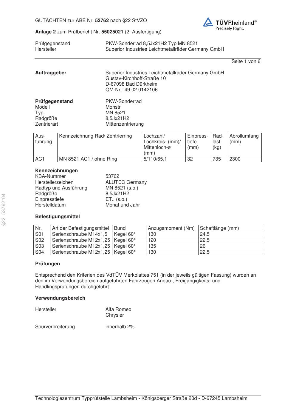 Dieses Gutachten (abe) bezieht sich auf die Alufelge ALUTEC MN 8521 in der Ausführung 8.5Jx21 ET 0, Mittenloch 0 mm (KBA 53762). Im PDF findest du typischerweise zulässige Reifengrößen, Auflagen/Anbauhinweise und – je nach Dokument – Hinweise zur Eintragung.