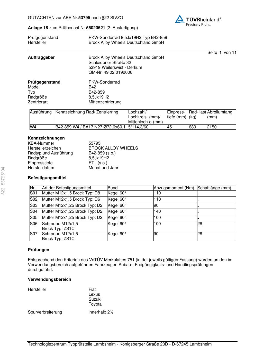Dieses Gutachten (abe) bezieht sich auf die Alufelge Brock B42-859 in der Ausführung 8.5Jx19 ET 0, Mittenloch 0 mm (KBA 53795). Im PDF findest du typischerweise zulässige Reifengrößen, Auflagen/Anbauhinweise und – je nach Dokument – Hinweise zur Eintragung.