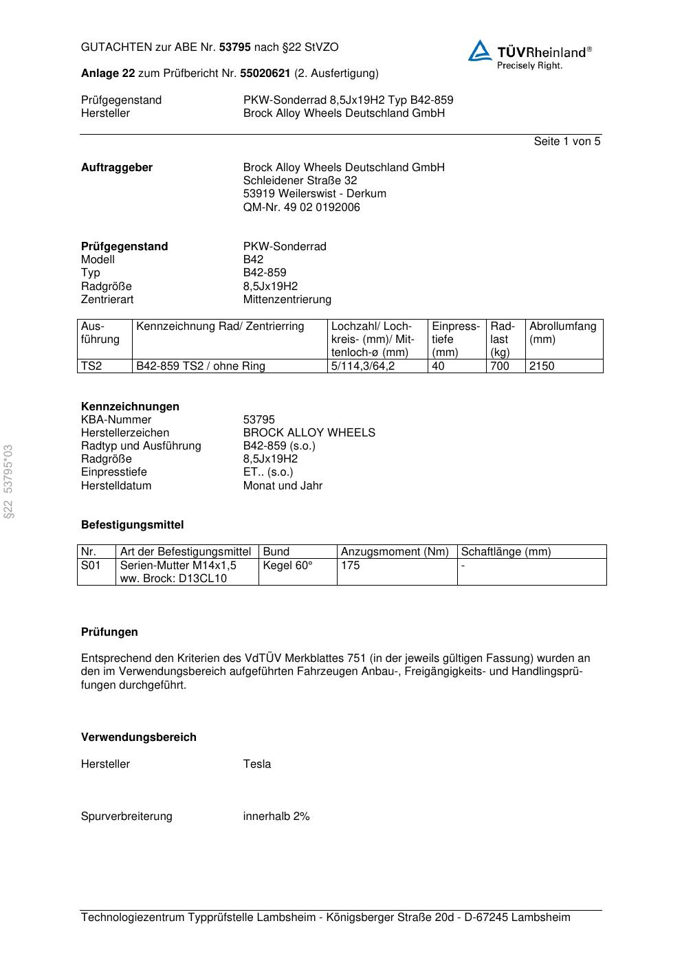 Felgengutachten / abe für Alufelgen Brock B42-859 (8.5Jx19 ET 0, Mittenloch 0 mm) mit KBA 53795 (Zertifikatsnummer 53795). Hier kostenlos als PDF herunterladen. Der Download-Link ist 24 Stunden gültig und kann bis zu zwei Mal verwendet werden.