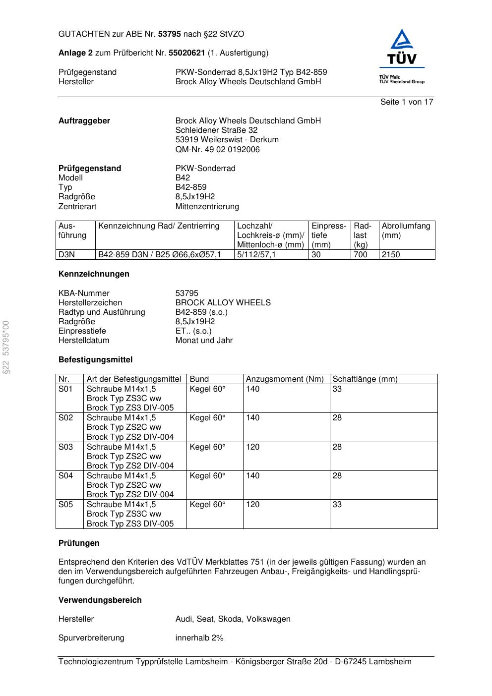 Dieses Gutachten (abe) bezieht sich auf die Alufelge Brock B42-859 in der Ausführung 8.5Jx19 ET 0, Mittenloch 0 mm (KBA 53795). Im PDF findest du typischerweise zulässige Reifengrößen, Auflagen/Anbauhinweise und – je nach Dokument – Hinweise zur Eintragung.