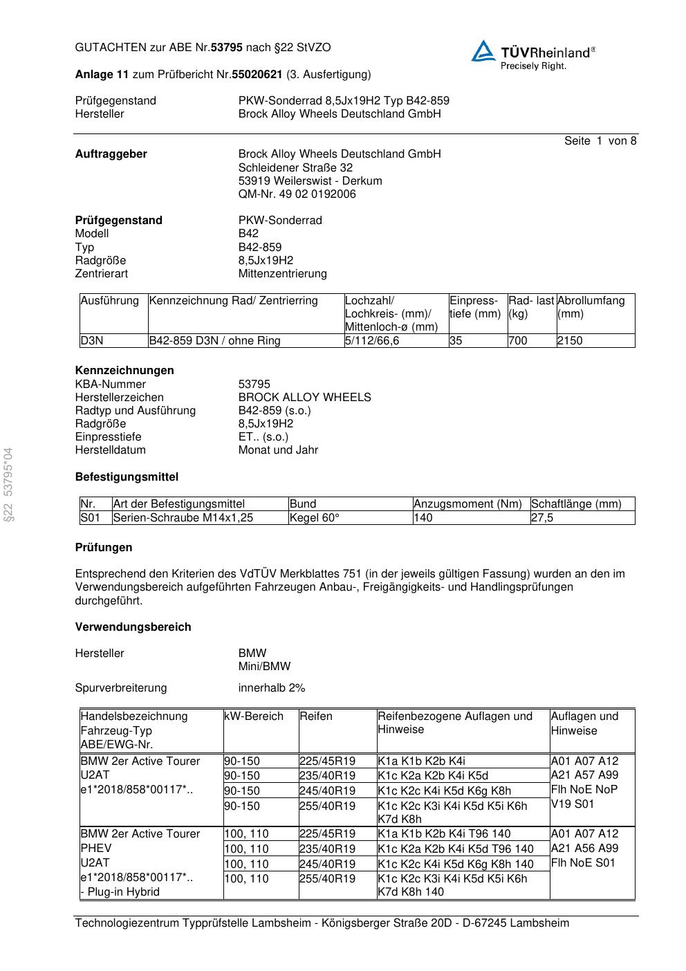 Dieses Gutachten (abe) bezieht sich auf die Alufelge Brock B42-859 in der Ausführung 8.5Jx19 ET 0, Mittenloch 0 mm (KBA 53795). Im PDF findest du typischerweise zulässige Reifengrößen, Auflagen/Anbauhinweise und – je nach Dokument – Hinweise zur Eintragung.