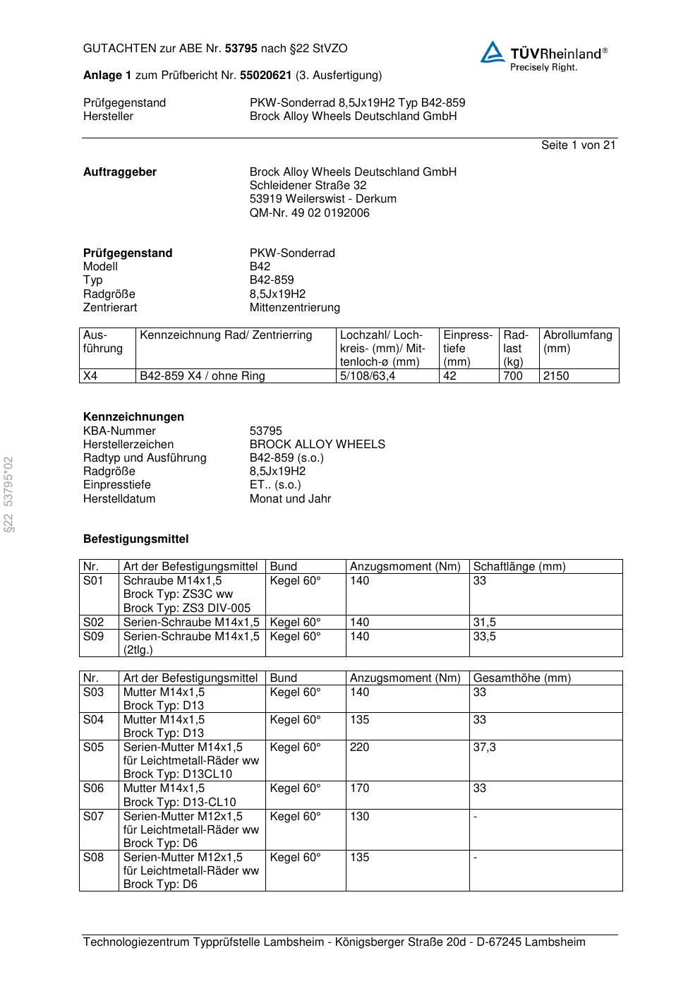 Dieses Gutachten (abe) bezieht sich auf die Alufelge Brock B42-859 in der Ausführung 8.5Jx19 ET 0, Mittenloch 0 mm (KBA 53795). Im PDF findest du typischerweise zulässige Reifengrößen, Auflagen/Anbauhinweise und – je nach Dokument – Hinweise zur Eintragung.