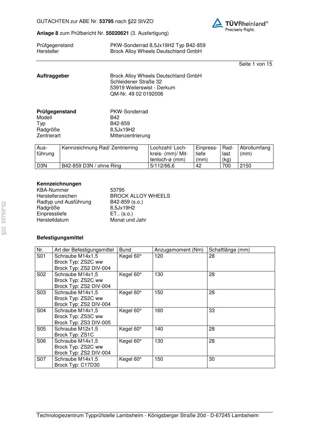 Felgengutachten / abe für Alufelgen Brock B42-859 (8.5Jx19 ET 0, Mittenloch 0 mm) mit KBA 53795 (Zertifikatsnummer 53795). Hier kostenlos als PDF herunterladen. Der Download-Link ist 24 Stunden gültig und kann bis zu zwei Mal verwendet werden.