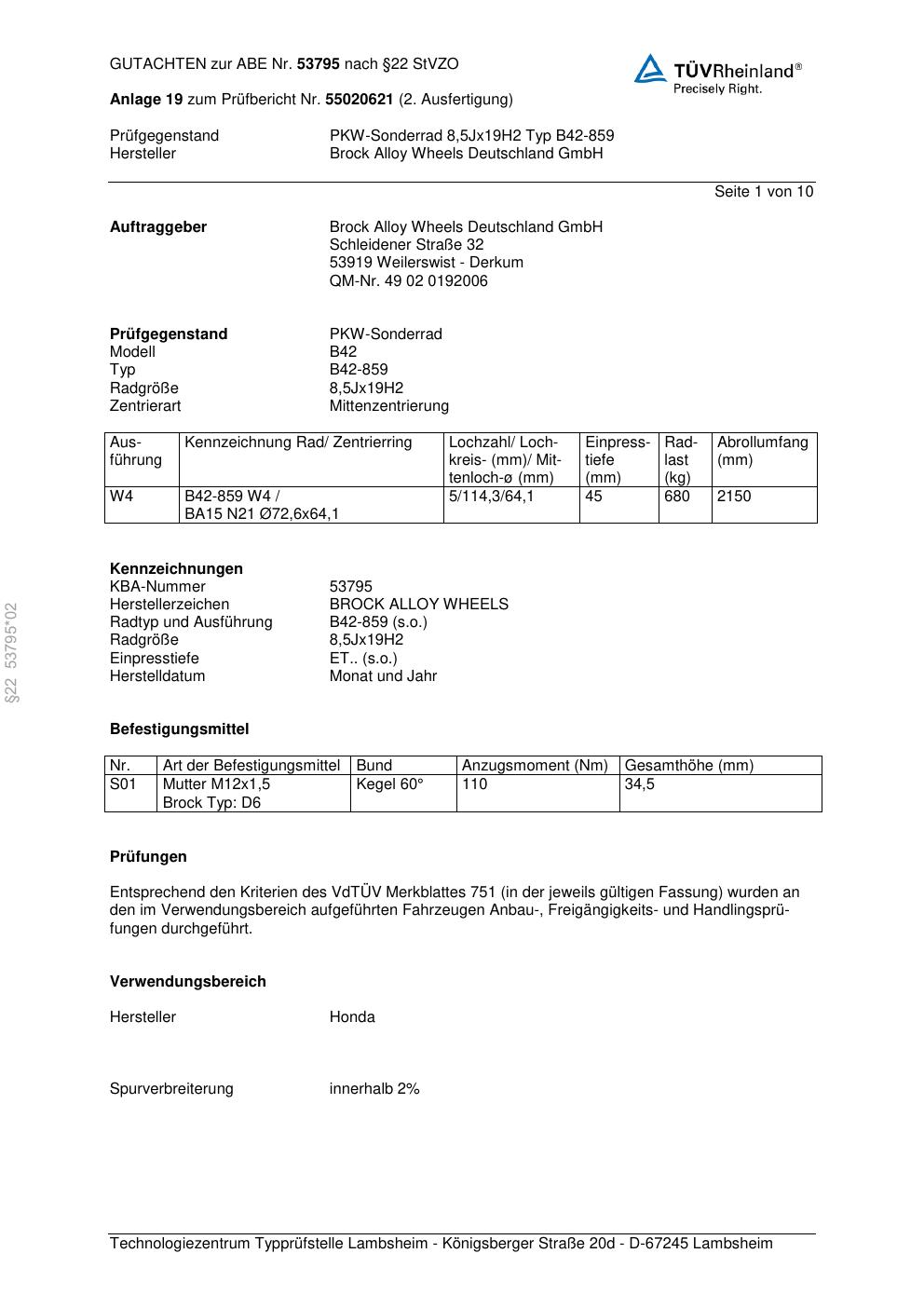 Dieses Gutachten (abe) bezieht sich auf die Alufelge Brock B42-859 in der Ausführung 8.5Jx19 ET 0, Mittenloch 0 mm (KBA 53795). Im PDF findest du typischerweise zulässige Reifengrößen, Auflagen/Anbauhinweise und – je nach Dokument – Hinweise zur Eintragung.