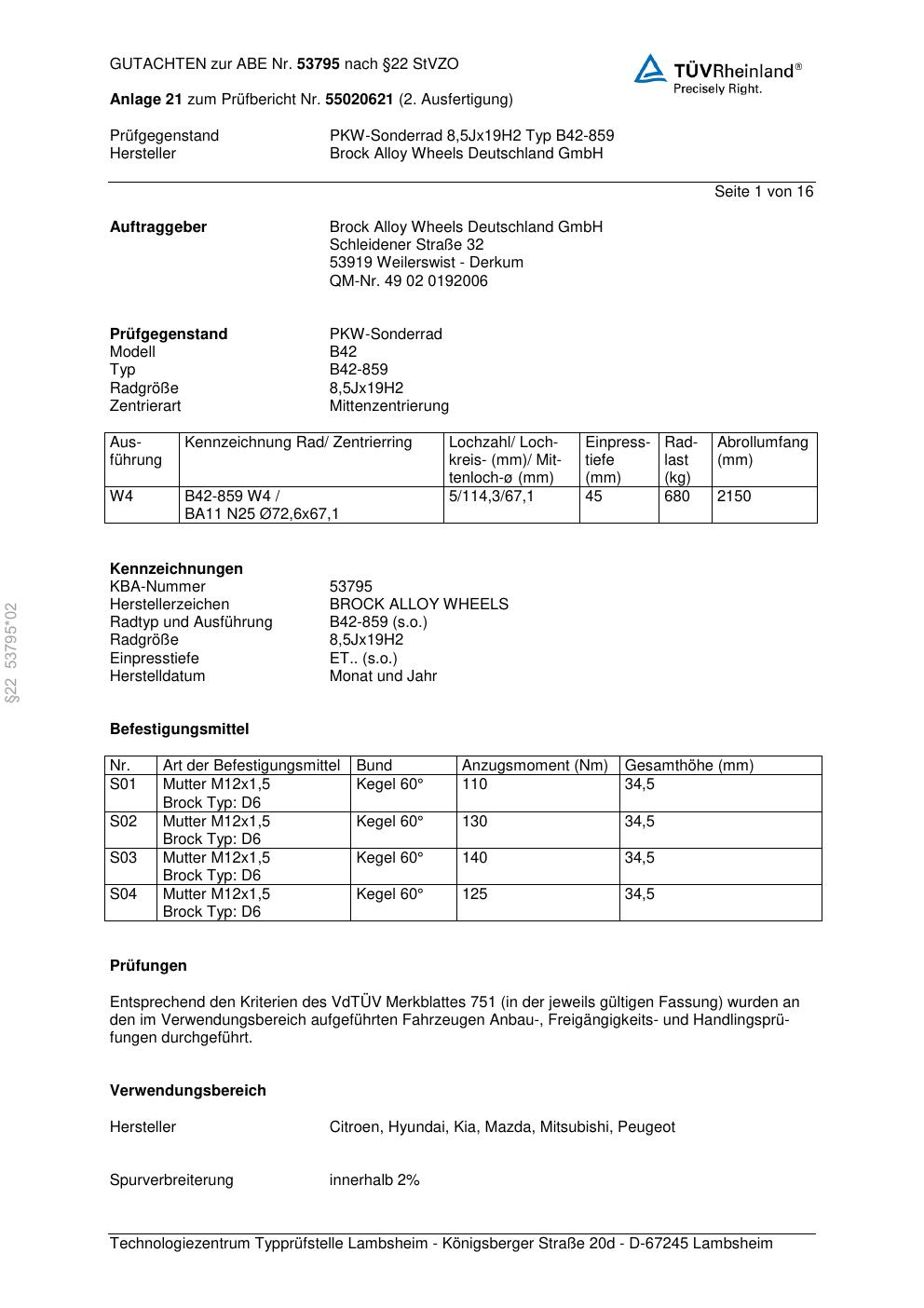 Dieses Gutachten (abe) bezieht sich auf die Alufelge Brock B42-859 in der Ausführung 8.5Jx19 ET 0, Mittenloch 0 mm (KBA 53795). Im PDF findest du typischerweise zulässige Reifengrößen, Auflagen/Anbauhinweise und – je nach Dokument – Hinweise zur Eintragung.