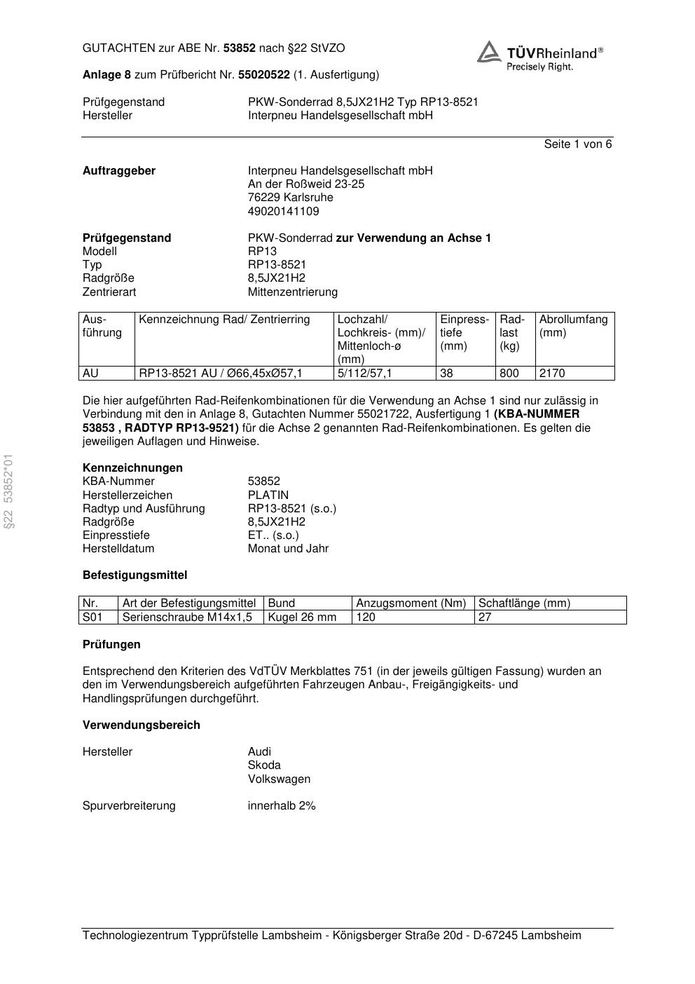 Dieses abe gehört zur Felge Platin RP13-852 1 in 8.5Jx21 ET0 mit KBA 53852. Die Seite ist dafür gedacht, dass du schnell prüfen kannst, ob KBA, Design und Größe zu deiner Felge passen und danach direkt das richtige PDF lädst.