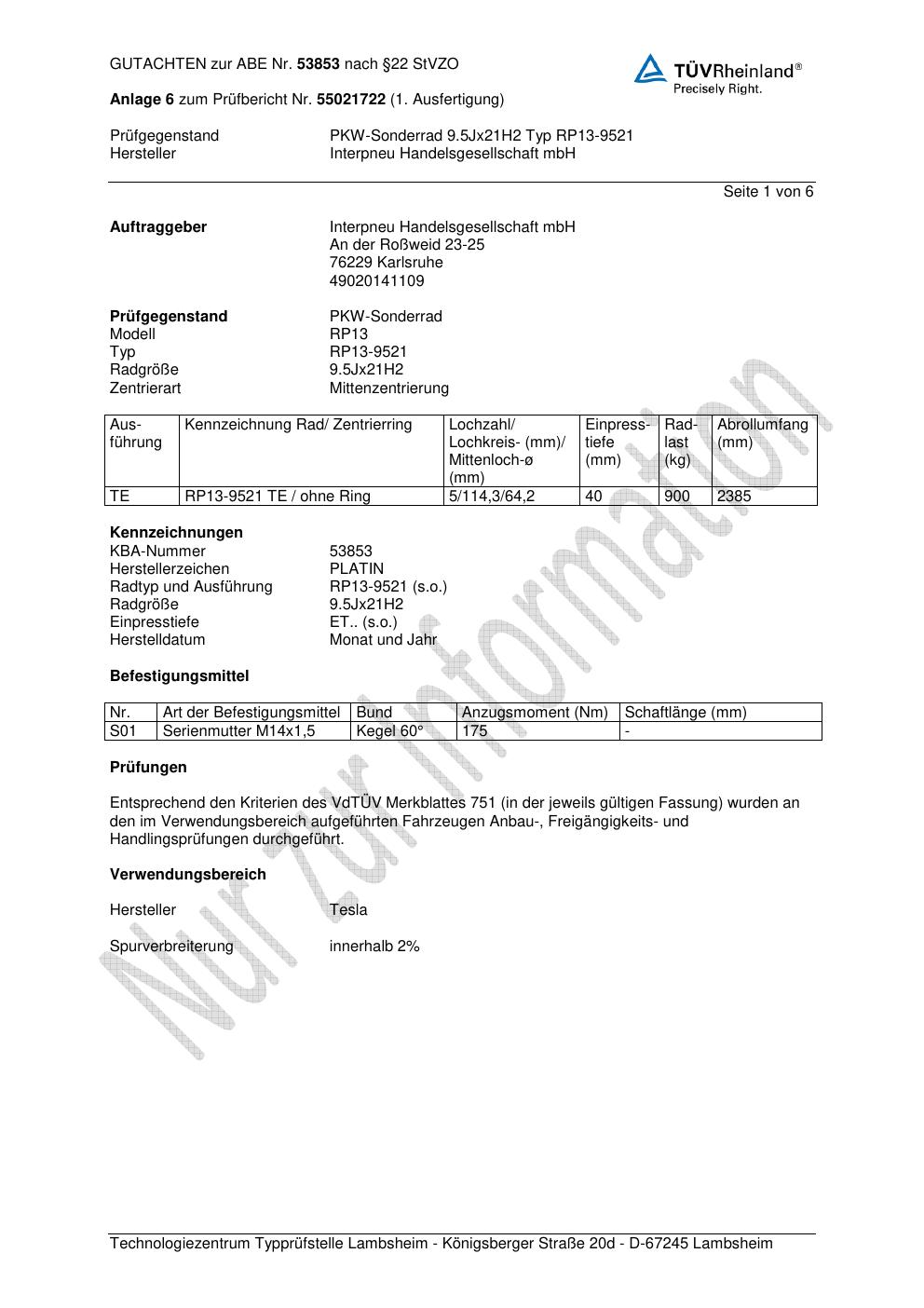 Felgengutachten / abe für Alufelgen Platin RP13-952 1 (9.5Jx21 ET 0, Mittenloch 0 mm) mit KBA 53853 (Zertifikatsnummer 53853). Hier kostenlos als PDF herunterladen. Der Download-Link ist 24 Stunden gültig und kann bis zu zwei Mal verwendet werden.