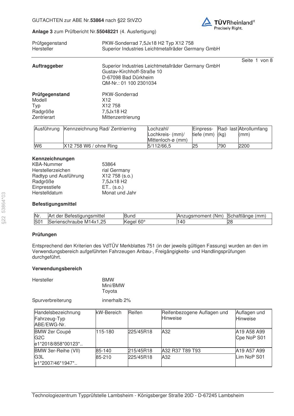 Dieses Gutachten (abe) bezieht sich auf die Alufelge brand-rial X12 758 in der Ausführung 7.5Jx18 ET 0, Mittenloch 0 mm (KBA 53864). Im PDF findest du typischerweise zulässige Reifengrößen, Auflagen/Anbauhinweise und – je nach Dokument – Hinweise zur Eintragung.