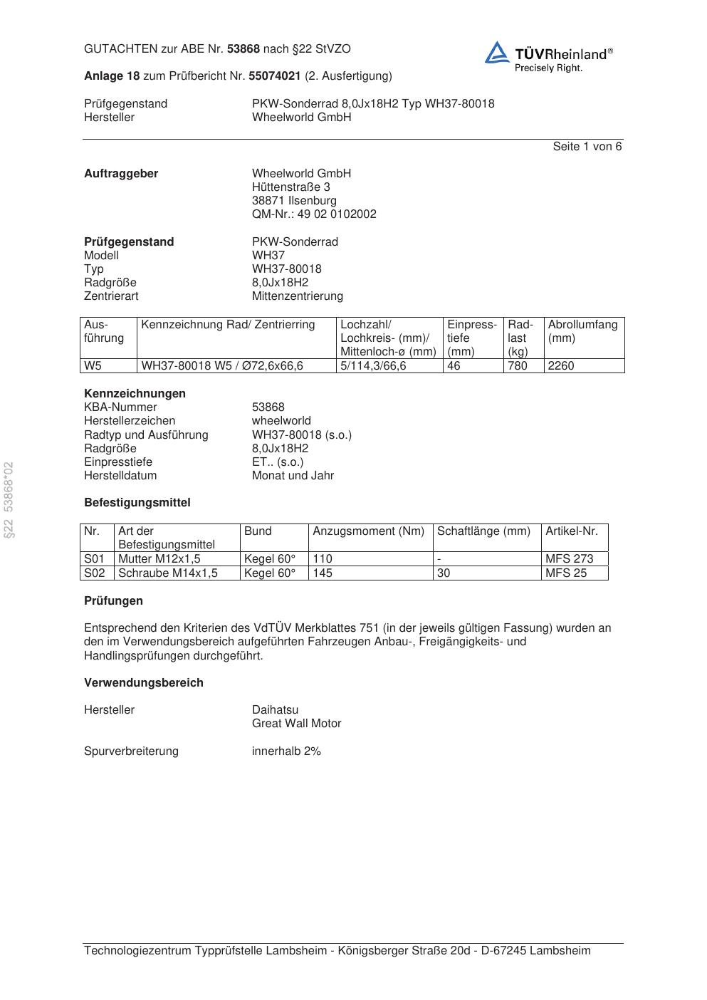 Dieses Gutachten (abe) bezieht sich auf die Alufelge ATS WH37-80018 in der Ausführung 8Jx18 ET 0, Mittenloch 0 mm (KBA 53868). Im PDF findest du typischerweise zulässige Reifengrößen, Auflagen/Anbauhinweise und – je nach Dokument – Hinweise zur Eintragung.