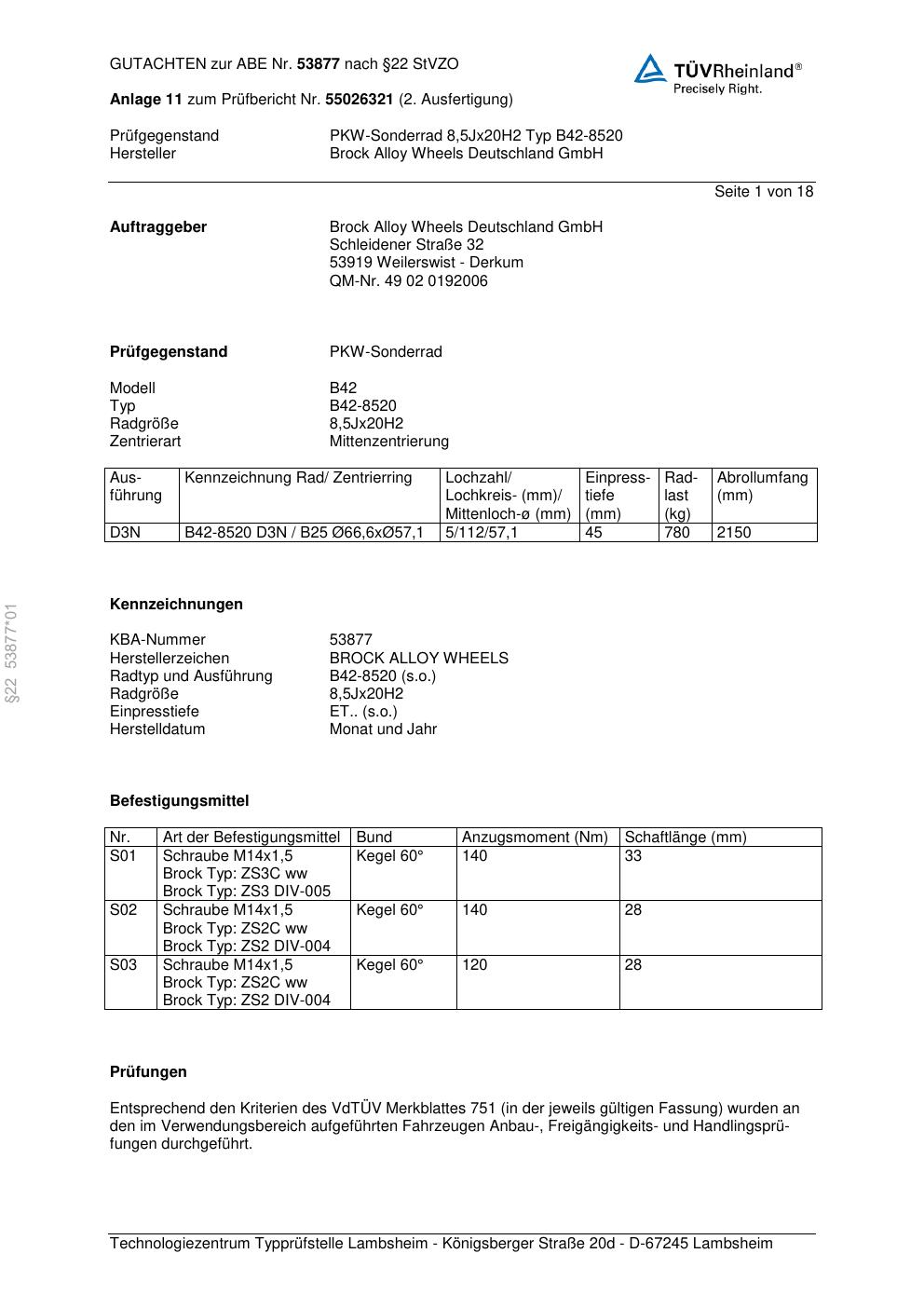 Dieses Gutachten (abe) bezieht sich auf die Alufelge Brock B42-8520 in der Ausführung 8.5Jx2 ET 0, Mittenloch 0 mm (KBA 53877). Im PDF findest du typischerweise zulässige Reifengrößen, Auflagen/Anbauhinweise und – je nach Dokument – Hinweise zur Eintragung.