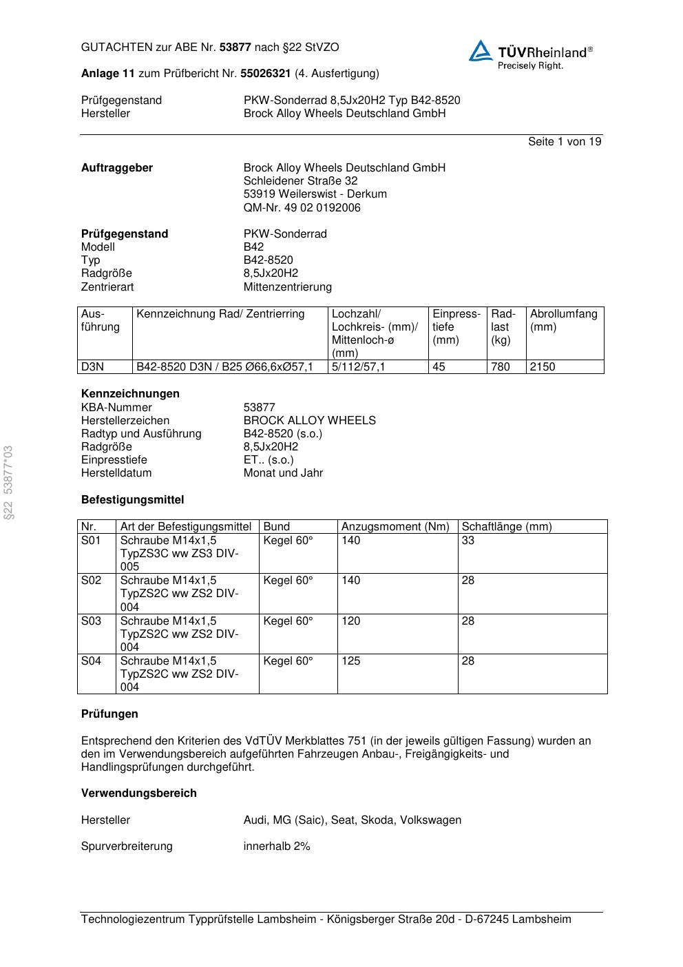 Dieses Gutachten (abe) bezieht sich auf die Alufelge Brock B42-8520 in der Ausführung 8.5Jx2 ET 0, Mittenloch 0 mm (KBA 53877). Im PDF findest du typischerweise zulässige Reifengrößen, Auflagen/Anbauhinweise und – je nach Dokument – Hinweise zur Eintragung.