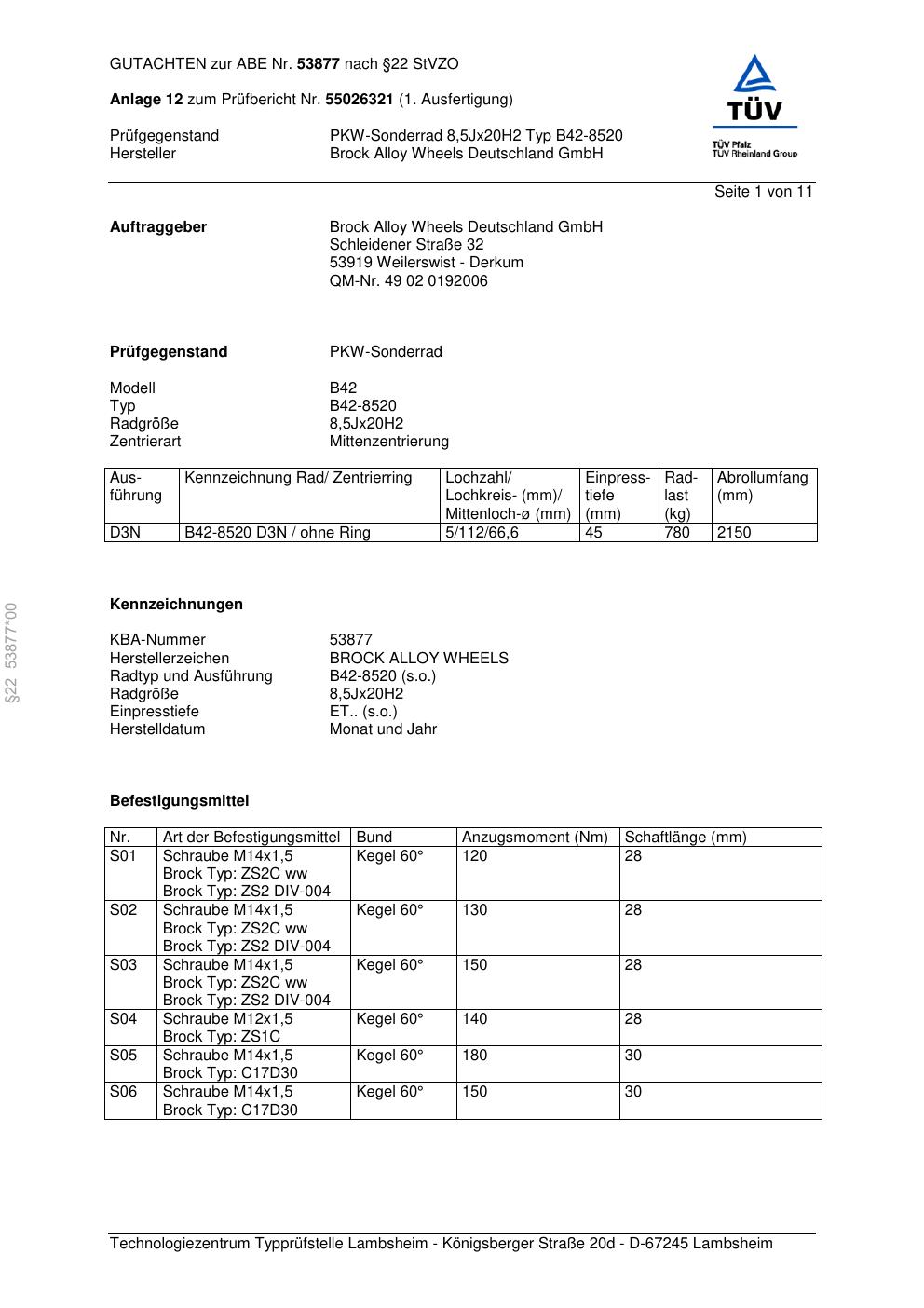 Dieses Gutachten (abe) bezieht sich auf die Alufelge Brock B42-8520 in der Ausführung 8.5Jx2 ET 0, Mittenloch 0 mm (KBA 53877). Im PDF findest du typischerweise zulässige Reifengrößen, Auflagen/Anbauhinweise und – je nach Dokument – Hinweise zur Eintragung.