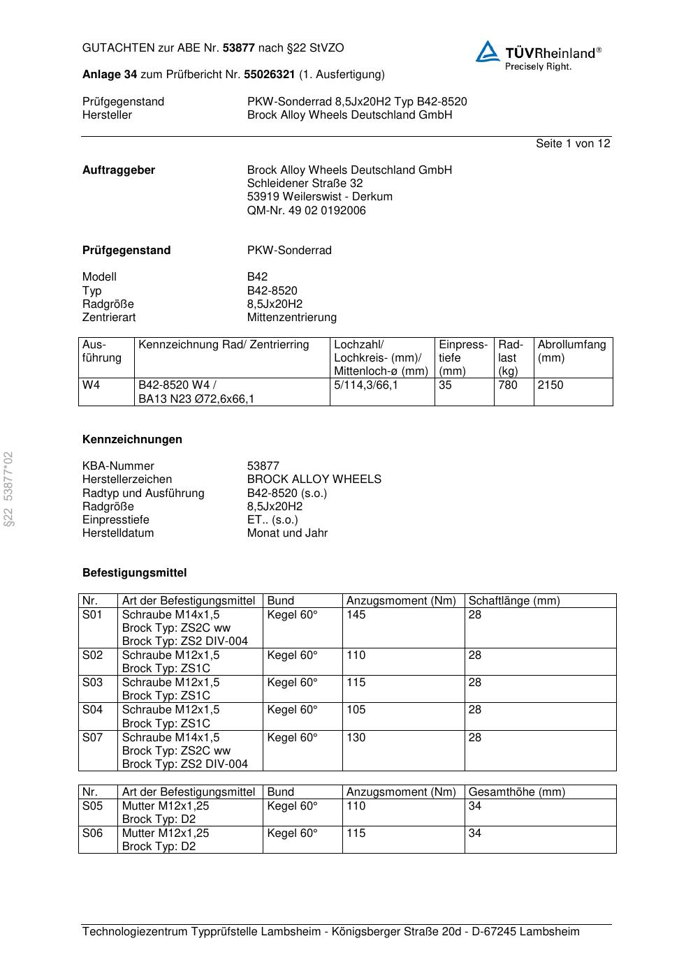 Dieses Gutachten (abe) bezieht sich auf die Alufelge Brock B42-8520 in der Ausführung 8.5Jx2 ET 0, Mittenloch 0 mm (KBA 53877). Im PDF findest du typischerweise zulässige Reifengrößen, Auflagen/Anbauhinweise und – je nach Dokument – Hinweise zur Eintragung.