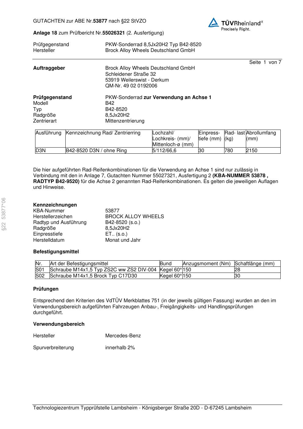 Dieses Gutachten (abe) bezieht sich auf die Alufelge Brock B42-8520 in der Ausführung 8.5Jx2 ET 0, Mittenloch 0 mm (KBA 53877). Im PDF findest du typischerweise zulässige Reifengrößen, Auflagen/Anbauhinweise und – je nach Dokument – Hinweise zur Eintragung.