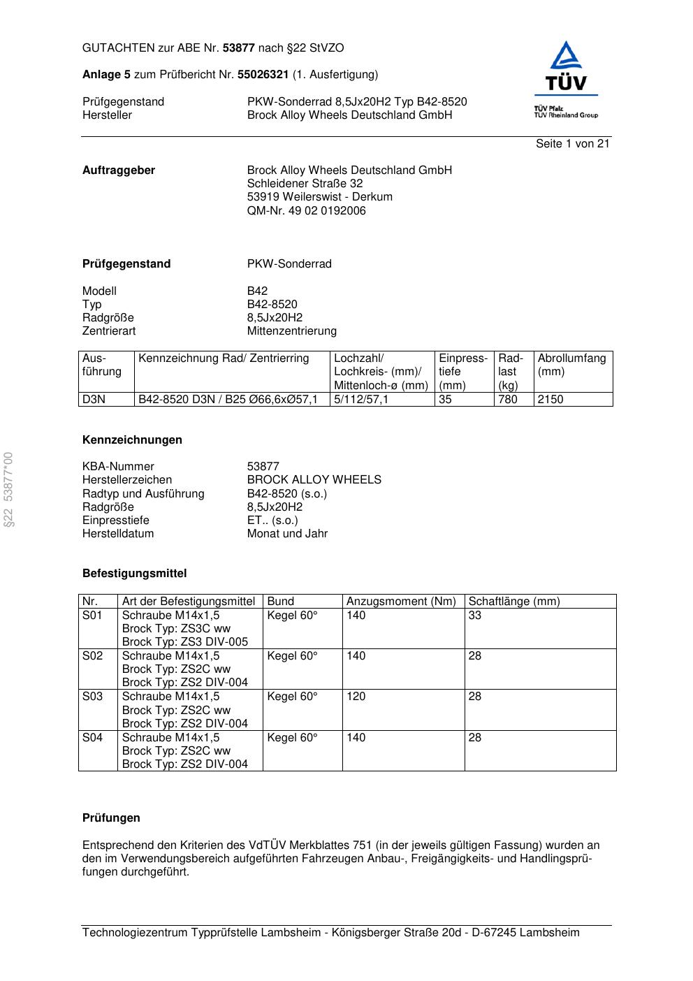 Felgengutachten / abe für Alufelgen Brock B42-8520 (8.5Jx2 ET 0, Mittenloch 0 mm) mit KBA 53877 (Zertifikatsnummer 53877). Hier kostenlos als PDF herunterladen. Der Download-Link ist 24 Stunden gültig und kann bis zu zwei Mal verwendet werden.