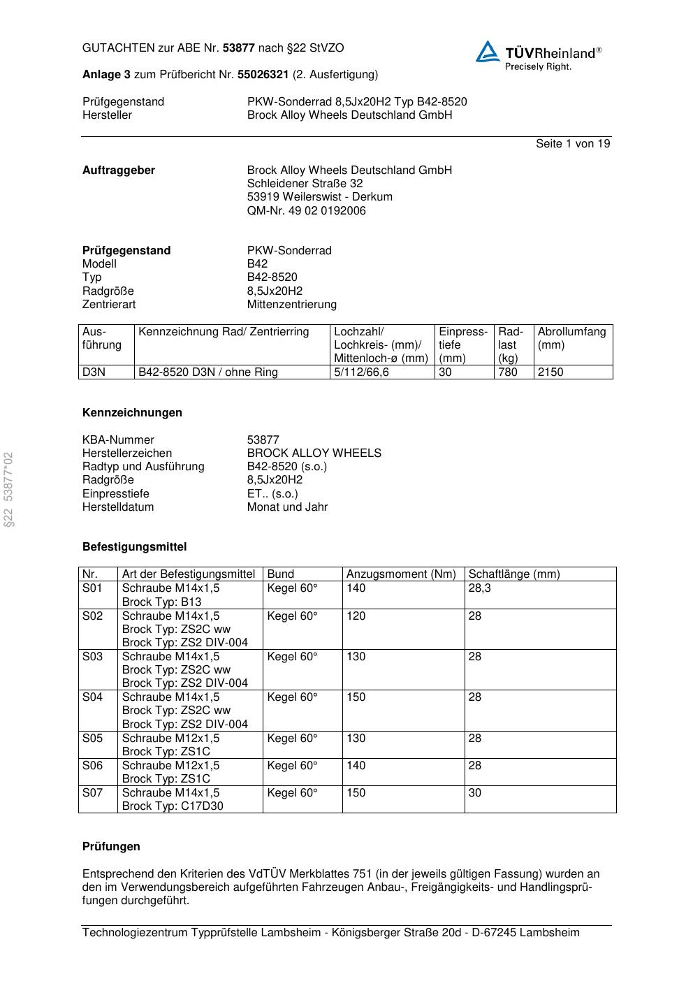 Dieses Gutachten (abe) bezieht sich auf die Alufelge Brock B42-8520 in der Ausführung 8.5Jx2 ET 0, Mittenloch 0 mm (KBA 53877). Im PDF findest du typischerweise zulässige Reifengrößen, Auflagen/Anbauhinweise und – je nach Dokument – Hinweise zur Eintragung.
