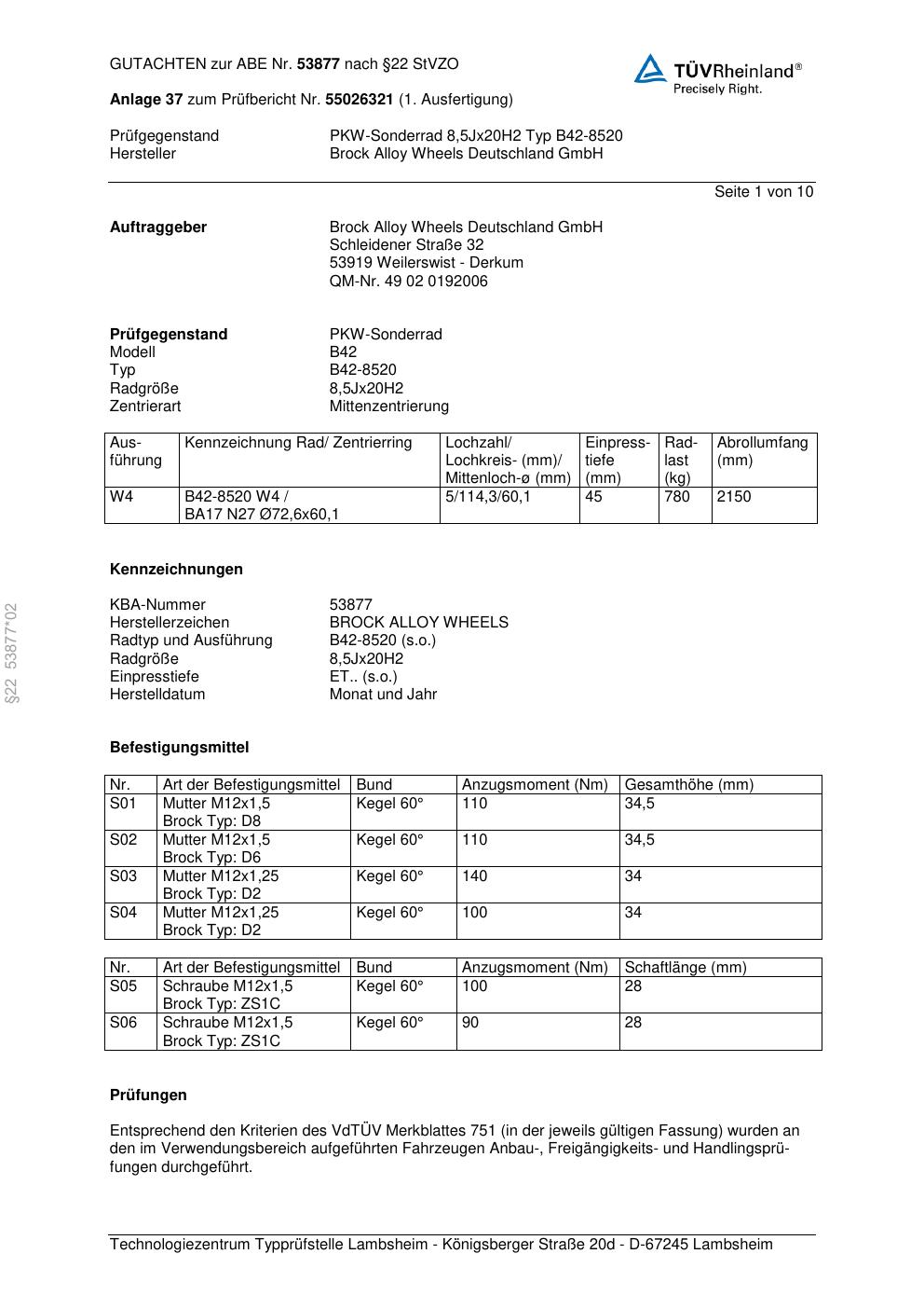 Dieses Gutachten (abe) bezieht sich auf die Alufelge Brock B42-8520 in der Ausführung 8.5Jx2 ET 0, Mittenloch 0 mm (KBA 53877). Im PDF findest du typischerweise zulässige Reifengrößen, Auflagen/Anbauhinweise und – je nach Dokument – Hinweise zur Eintragung.