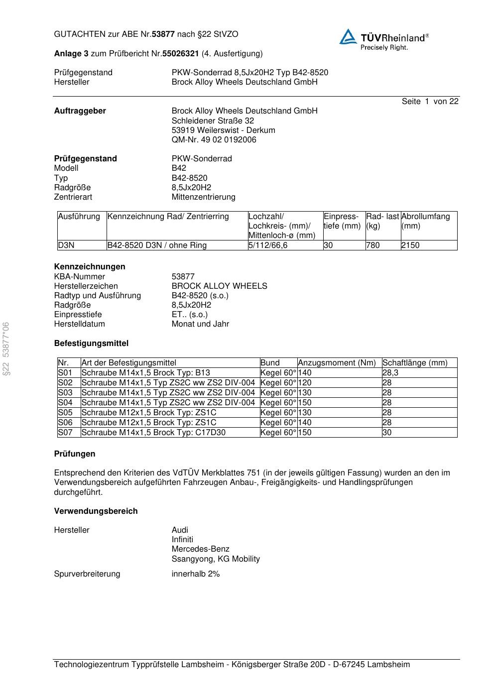 Dieses Gutachten (abe) bezieht sich auf die Alufelge Brock B42-8520 in der Ausführung 8.5Jx2 ET 0, Mittenloch 0 mm (KBA 53877). Im PDF findest du typischerweise zulässige Reifengrößen, Auflagen/Anbauhinweise und – je nach Dokument – Hinweise zur Eintragung.