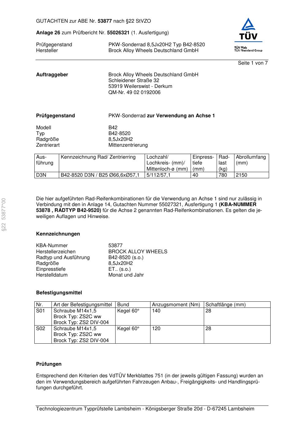 Dieses Gutachten (abe) bezieht sich auf die Alufelge Brock B42-8520 in der Ausführung 8.5Jx2 ET 0, Mittenloch 0 mm (KBA 53877). Im PDF findest du typischerweise zulässige Reifengrößen, Auflagen/Anbauhinweise und – je nach Dokument – Hinweise zur Eintragung.