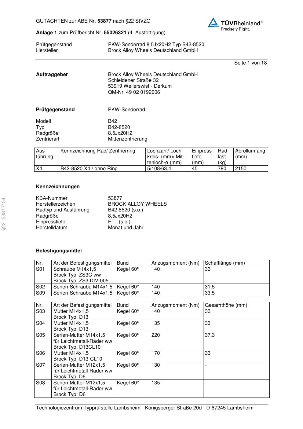Dieses Gutachten (abe) bezieht sich auf die Alufelge Brock B42-8520 in der Ausführung 8.5Jx2 ET 0, Mittenloch 0 mm (KBA 53877). Im PDF findest du typischerweise zulässige Reifengrößen, Auflagen/Anbauhinweise und – je nach Dokument – Hinweise zur Eintragung.