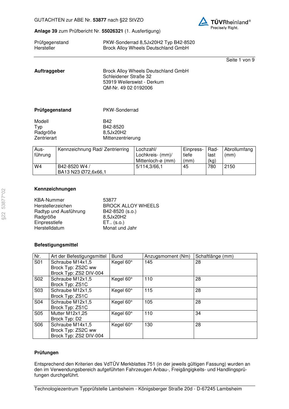 Dieses Gutachten (abe) bezieht sich auf die Alufelge Brock B42-8520 in der Ausführung 8.5Jx2 ET 0, Mittenloch 0 mm (KBA 53877). Im PDF findest du typischerweise zulässige Reifengrößen, Auflagen/Anbauhinweise und – je nach Dokument – Hinweise zur Eintragung.