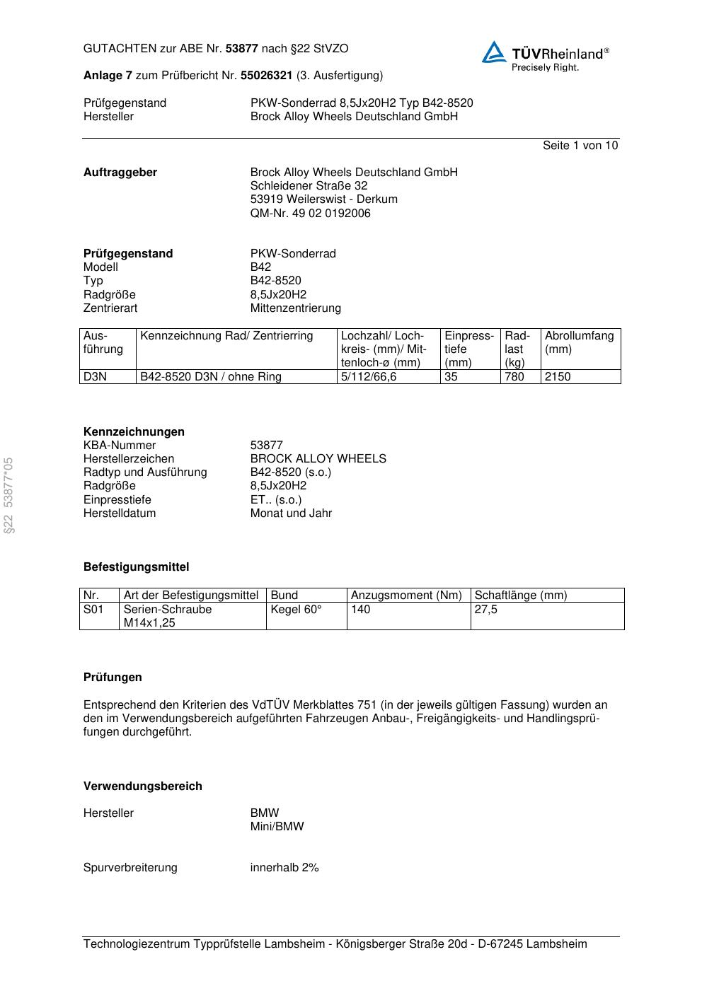 Dieses Gutachten (abe) bezieht sich auf die Alufelge Brock B42-8520 in der Ausführung 8.5Jx2 ET 0, Mittenloch 0 mm (KBA 53877). Im PDF findest du typischerweise zulässige Reifengrößen, Auflagen/Anbauhinweise und – je nach Dokument – Hinweise zur Eintragung.