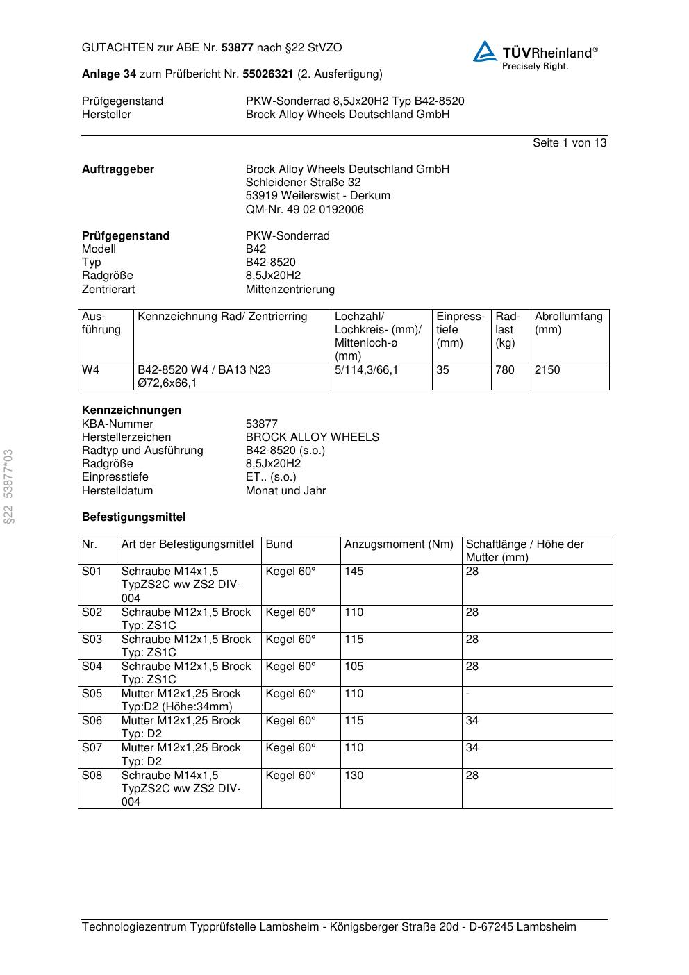Dieses Gutachten (abe) bezieht sich auf die Alufelge Brock B42-8520 in der Ausführung 8.5Jx2 ET 0, Mittenloch 0 mm (KBA 53877). Im PDF findest du typischerweise zulässige Reifengrößen, Auflagen/Anbauhinweise und – je nach Dokument – Hinweise zur Eintragung.