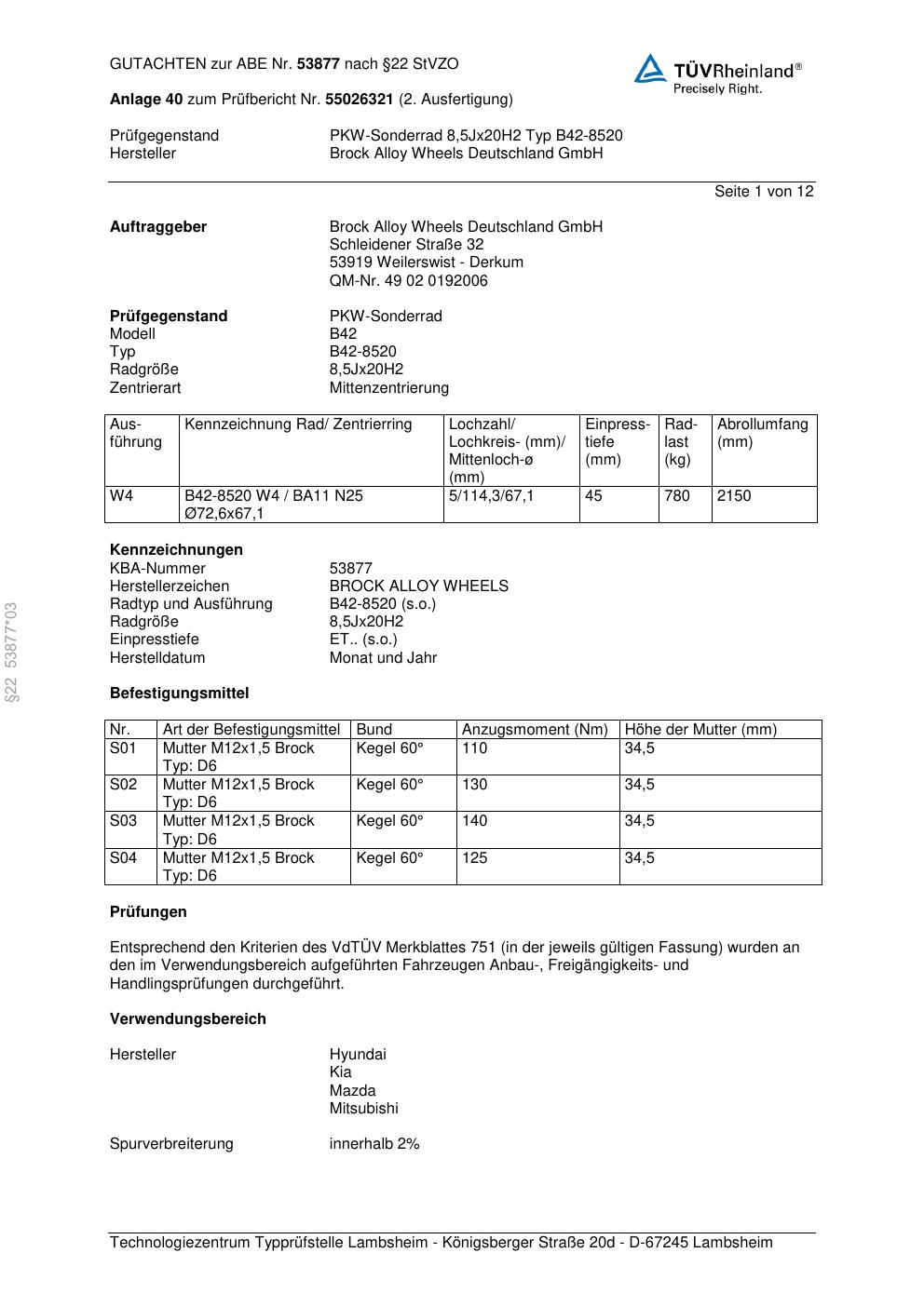 Dieses Gutachten (abe) bezieht sich auf die Alufelge Brock B42-8520 in der Ausführung 8.5Jx2 ET 0, Mittenloch 0 mm (KBA 53877). Im PDF findest du typischerweise zulässige Reifengrößen, Auflagen/Anbauhinweise und – je nach Dokument – Hinweise zur Eintragung.