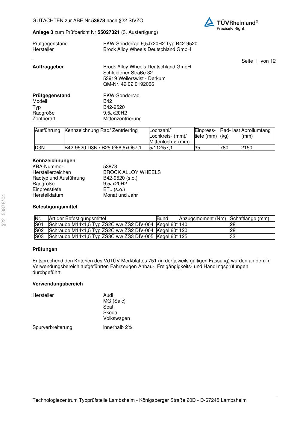 Dieses Gutachten (abe) bezieht sich auf die Alufelge Brock B42-9520 in der Ausführung 9.5Jx2 ET 0, Mittenloch 0 mm (KBA 53878). Im PDF findest du typischerweise zulässige Reifengrößen, Auflagen/Anbauhinweise und – je nach Dokument – Hinweise zur Eintragung.